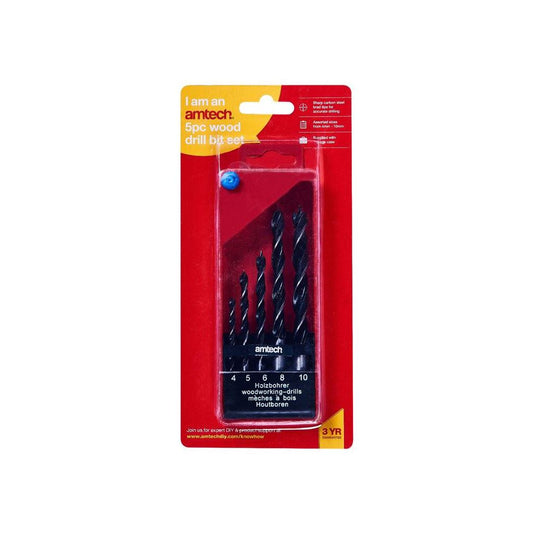 Amtech 5 Piece Wood Drill Bit Set In Case Professional Quality+Carbon Steel Tips - F1450