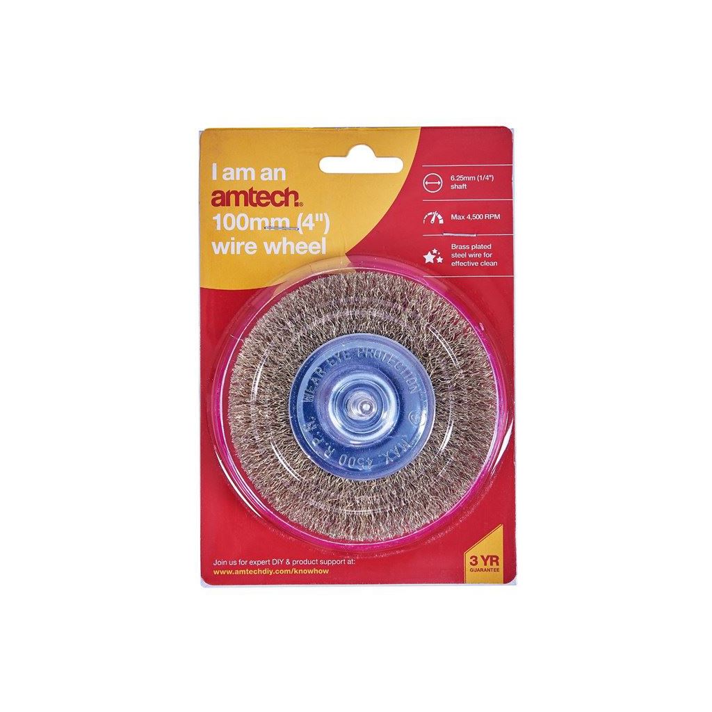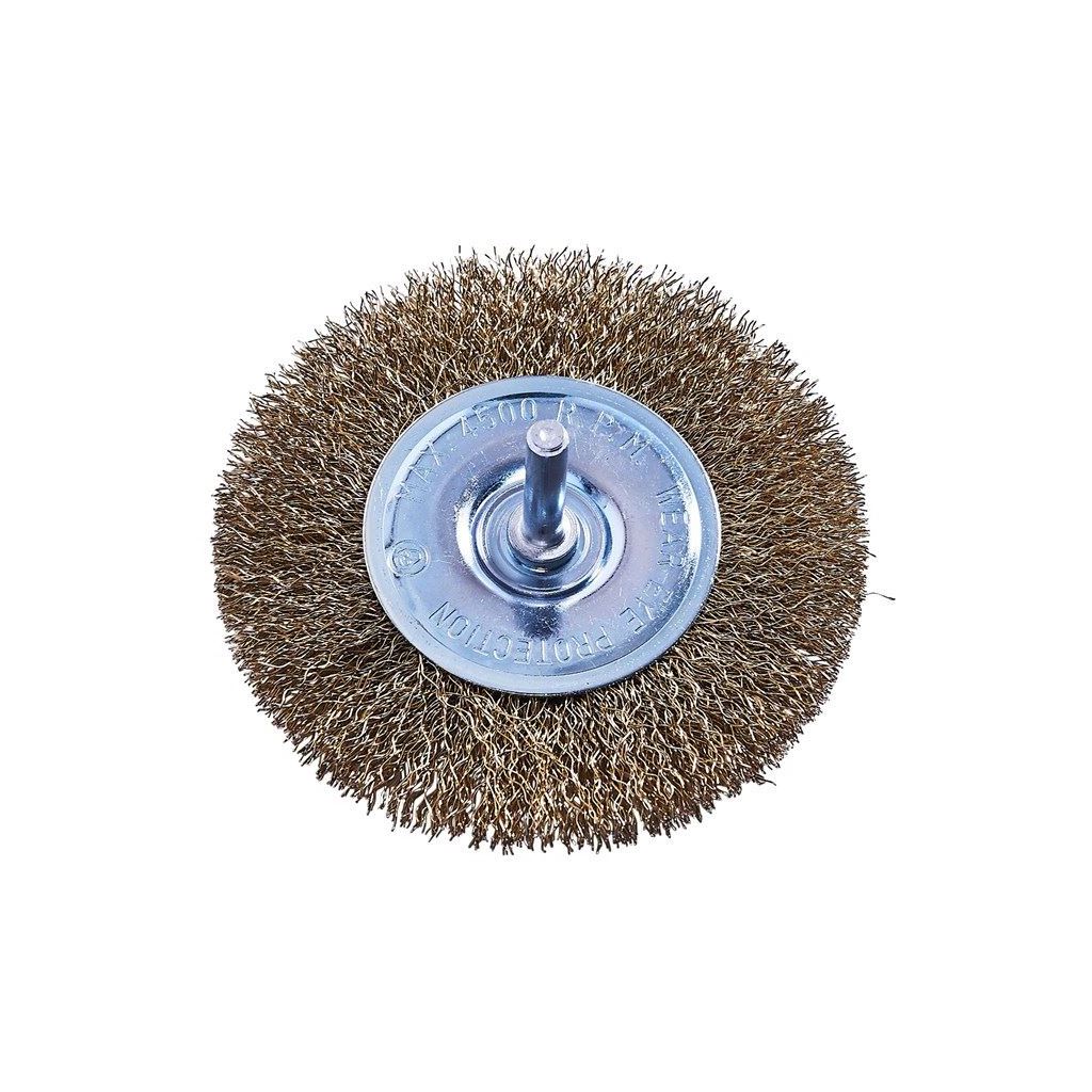 1/4" shank zinc plated steel arbor. Brass plated wire. Removes rust, paint, scale and dirt etc. Maximum 4500 rpm.