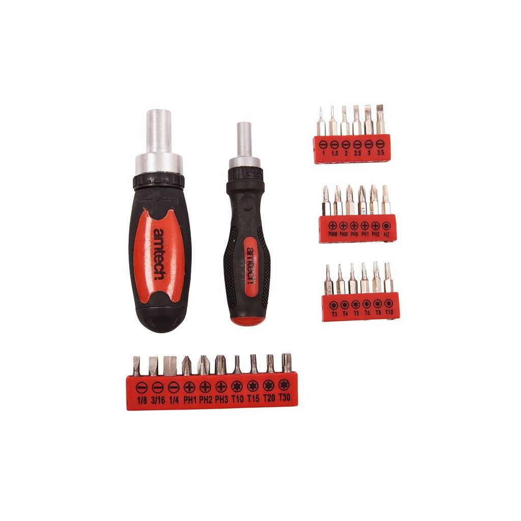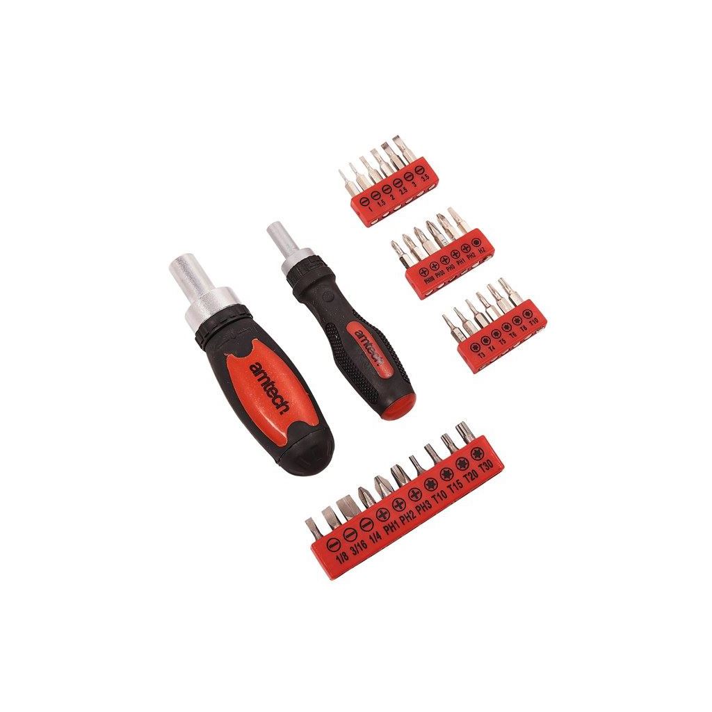 Mini ratchet handle for precision kits. High torque stubby ratchet handle. 10pc 25mm chrome vanadium screwdriver bits (Torx, Phillips & Slotted). 18pc assorted precision bits (Torx, Phillips & Slotted). Ratchet with forward/reverse facility. Cushioned handle with convenient four bit storage.