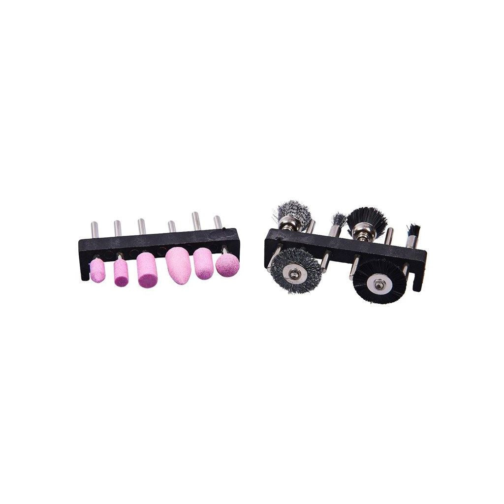 Set includes 6pc mounted stones (3.17mm), 3pc steel wheel brushes (3.17mm), 3pc nylon wheel brushes (3.17mm). Ideal for most polishing applications.