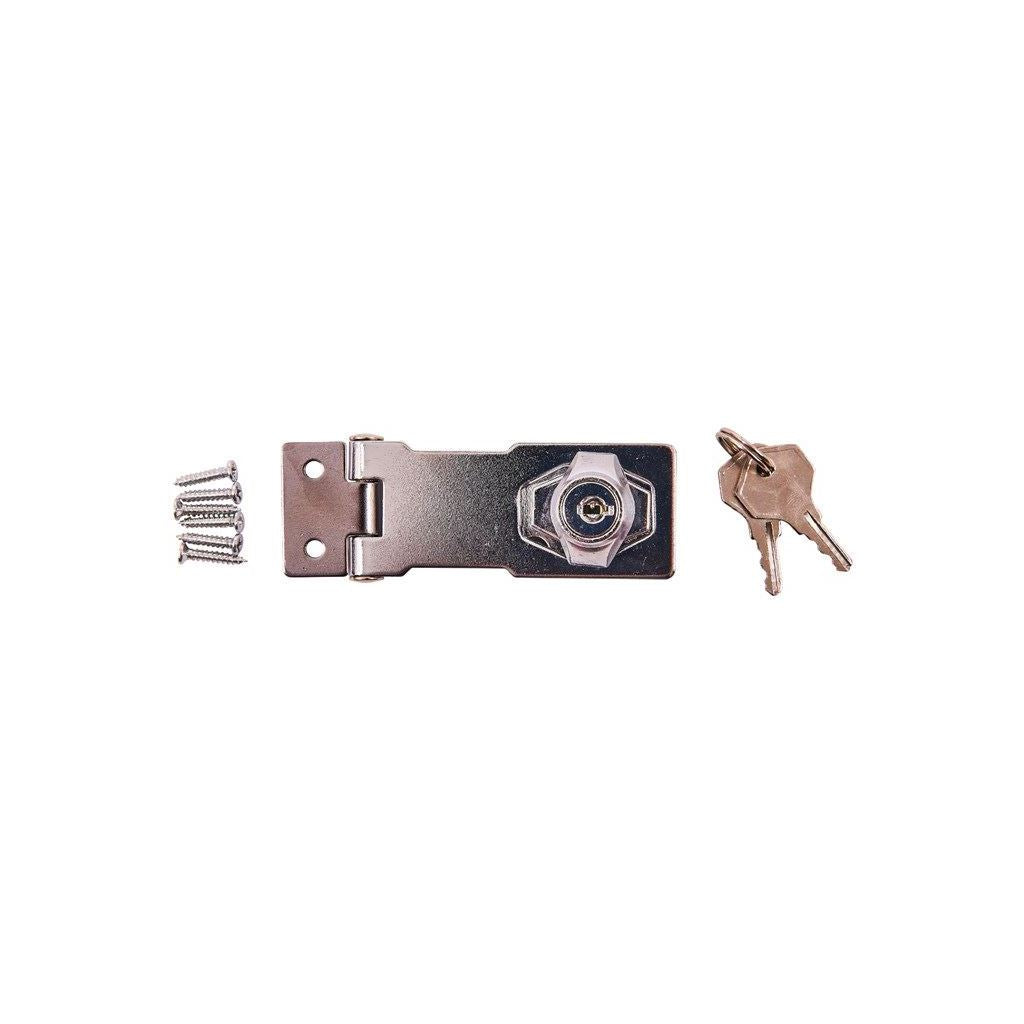 Integral self-locking mechanism. Durable zinc alloy and steel construction. Supplied with two keys and 6 screws. Suitable for low level security applications (display cabinets, storage units etc). Hasp width: 32mm. Not suitable for outdoor use.