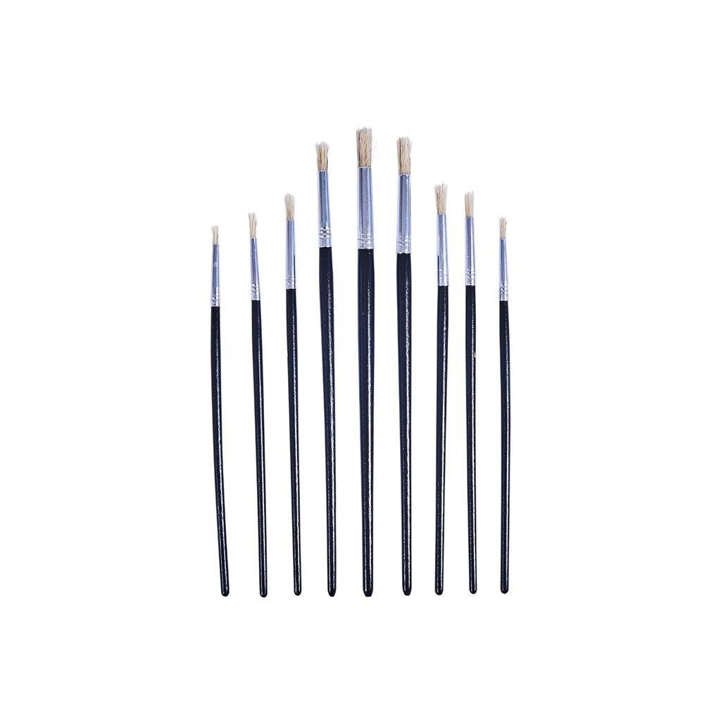 An assortment of nine artists paint brushes with wooden handles. Can also be used for hobbyist, craft work and painting models. Sizes imprinted on each brush (1 - 9).