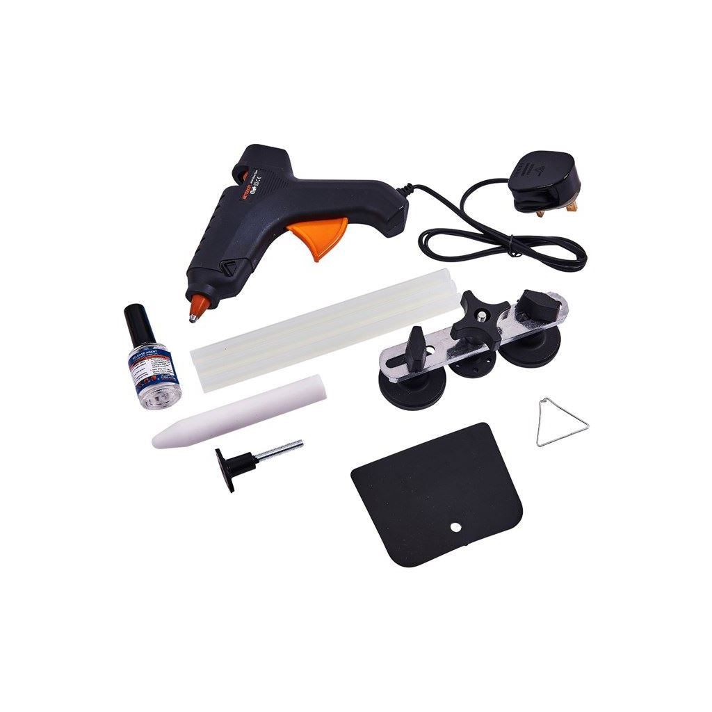 Kit includes hot glue gun with glue sticks, glue scraper, dent pulling tabs with wing nut, pulling bridge and knockdown. Ideal for fixing dings and dents on your vehicle. Quick and easy to use with simple 1-2-3 steps to complete the job.