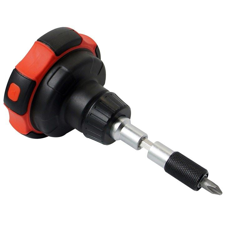 Ratchet head with forward and reverse function. Detachable bit holder extension. Quick release bit holder. Compartment can hold up to 14 bits and bit holder extension. Includes 14 chrome vanadium bits: Hex 4mm, 5mm, Phillips #1, #2, #3, Slotted 5mm, 6mm, 7mm, Pozi PZ1, PZ2, PZ3 and Torx T10, T15, T20.