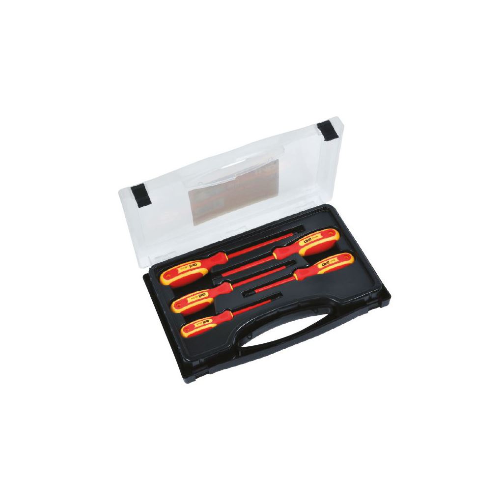 Chrome vanadium blades for extra strength. Soft grip handles for increased comfort. For live working up to 1,000V. IEC 60900:2004.. Contents: 2 x PZ, sizes: 1 x 80 & 2 x 100mm, 3 x slotted, sizes: 3 x 75, 4 x 100 & 5.5 x 125mm.