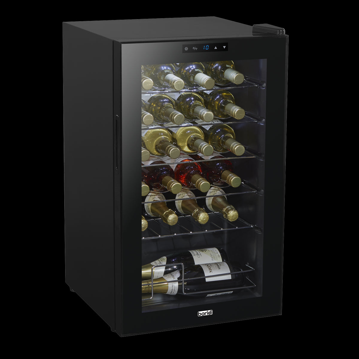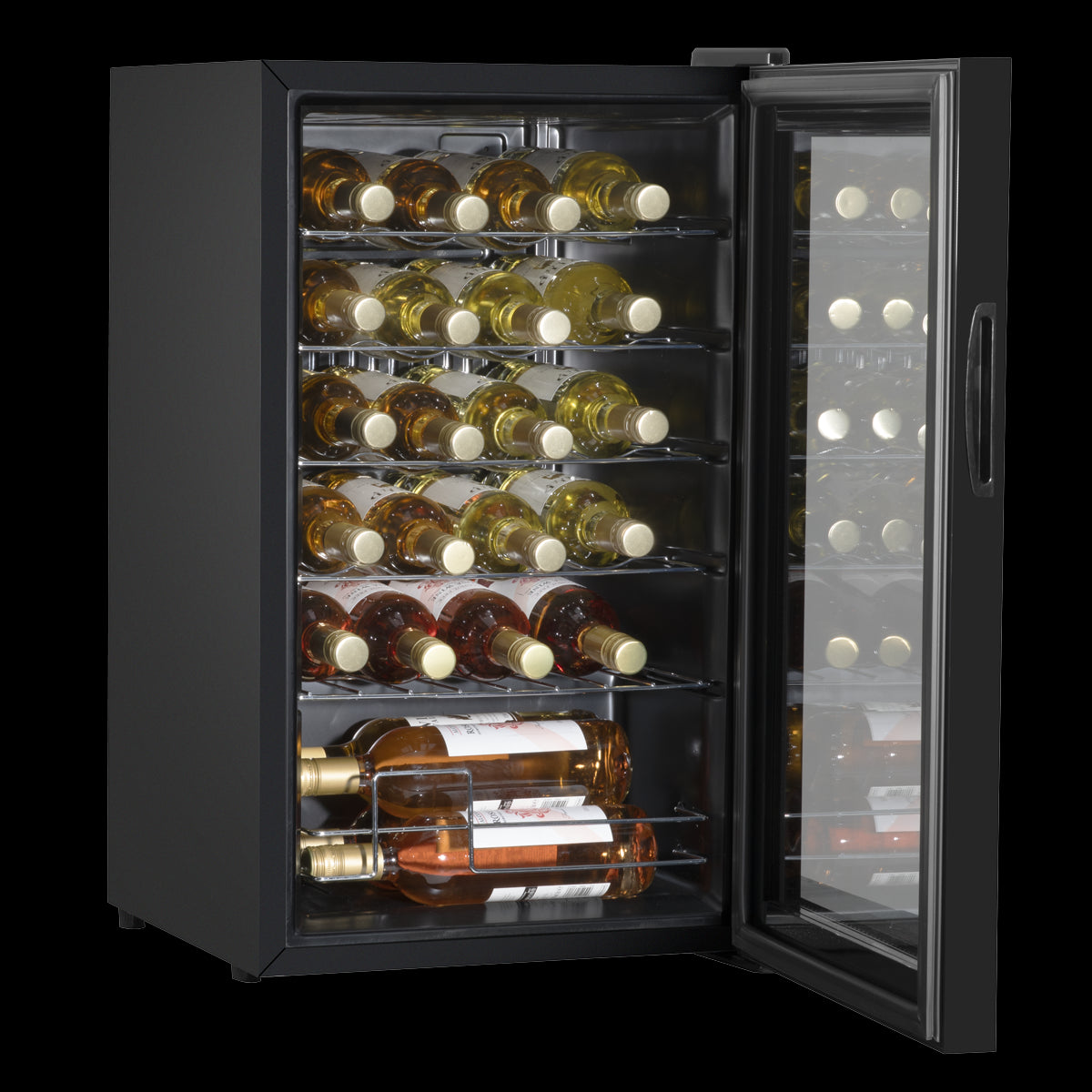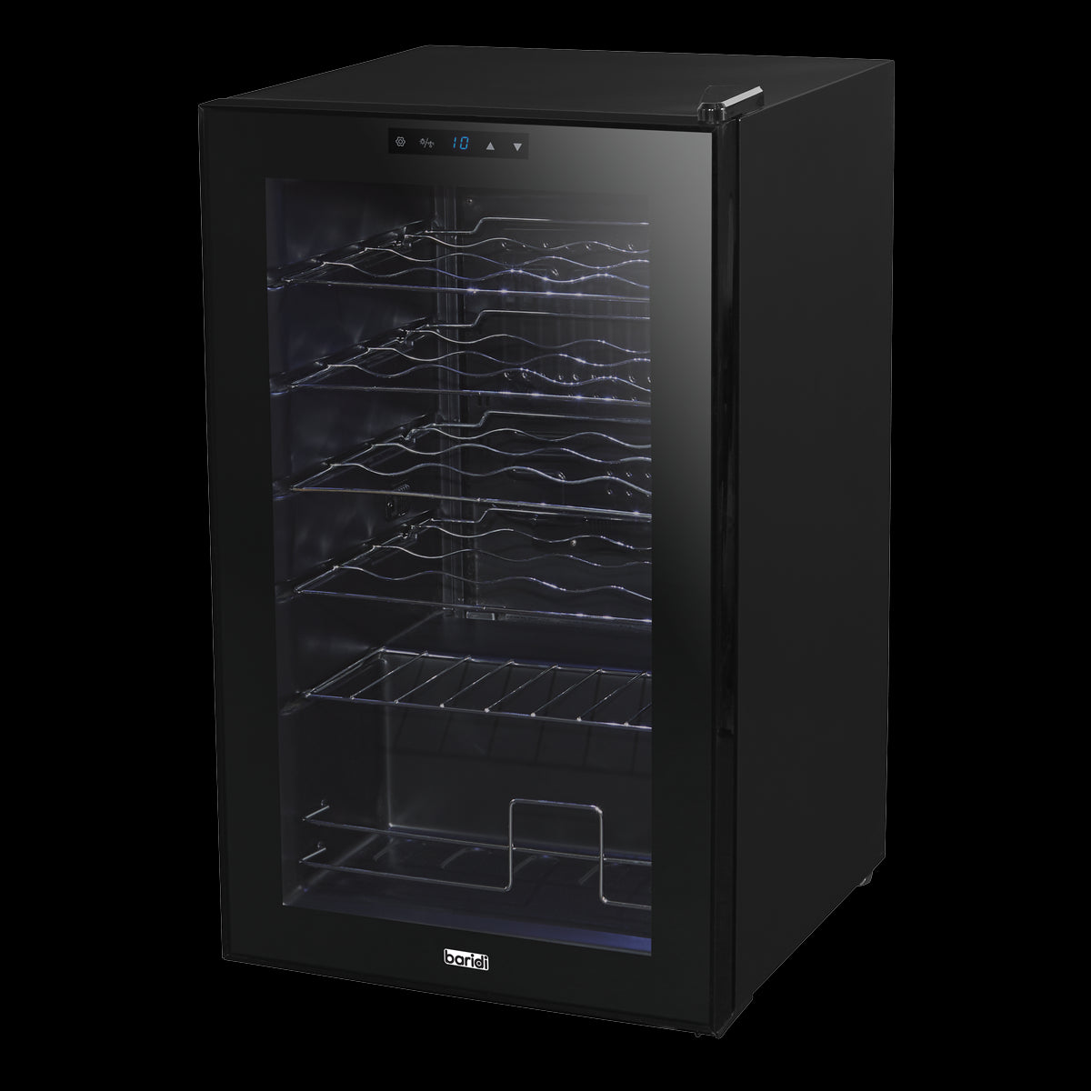 Sleek and compact design with tempered mirror glass door to reflect UV light and help protect your wine. Temperature range between 5-18�C controlled by touchscreen controls. (Recommended ambient temperature up to 25�C). Features soft white LED light. Waved metal shelves with space for up to 24 bottles of wine. Accommodates a maximum bottle height of 330mm. Compressor cooling technology with automatic defrost feature to make this unit as easy as possible to use. Energy Efficiency Class G. Power Cable Length 1.8m. Ventilation Space - a minimum space of 50mm is required for the rear of the fridge and 30mm for the top and both sides. This will maximise the efficiency, performance and life of the fridge and also ensure that there is sufficient space for the hinge to operate effectively.