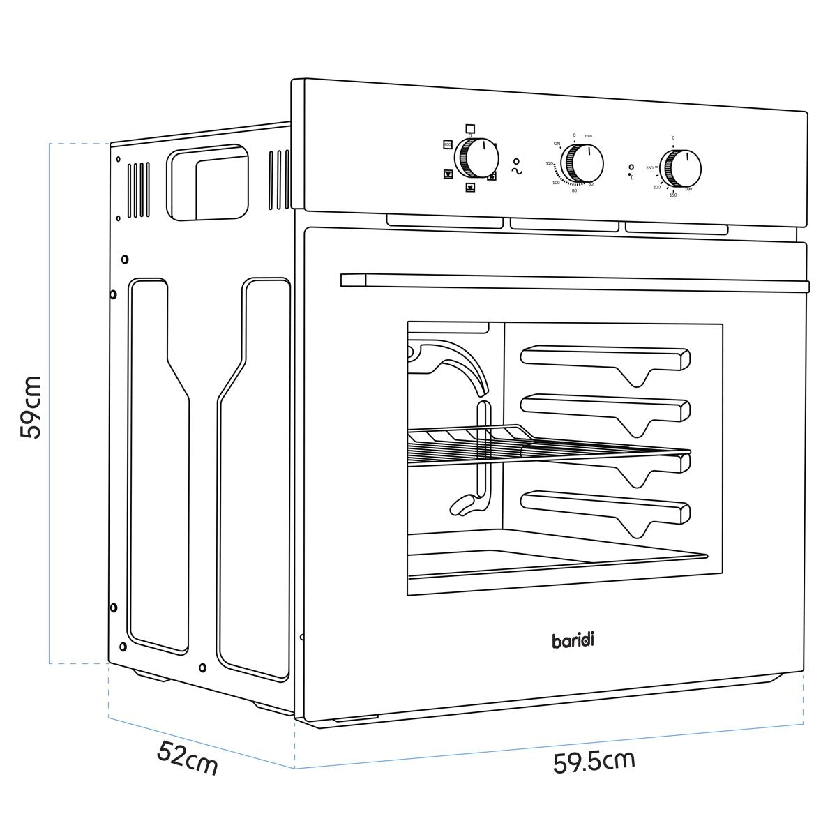 With its large 55L capacity and consistent temperatures, this oven will help you cook the perfect meal every time. Featuring five functions: Fan and Grill, Fan and Bottom Heating, Intensive Bake, Defrost and ECO modes. 120 Minute mechanical timer ensures you can keep an eye on how long our dishes have been cooking. 1300W Top element and 1000W bottom element ensure an even heat for a flawless cooking experience. Includes four shelf positions and a baking tray/grill shelf that provide extensive versatility to suit all your cooking and baking needs. Designed to complement Baridi Cooker hoods and hobs as well as our range of wine coolers and drinks fridges. Dimensions (W x D x H): Oven Size; 595 x 520 x 590mm, Internal; 450 x 370 x 340mm.