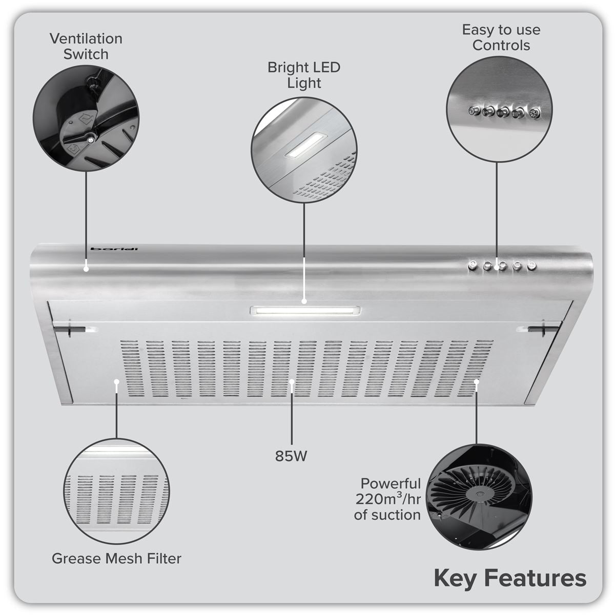 • 85W Cooker hood extractor fans with 220m�/hr of suction and 3-speed push-button control.
