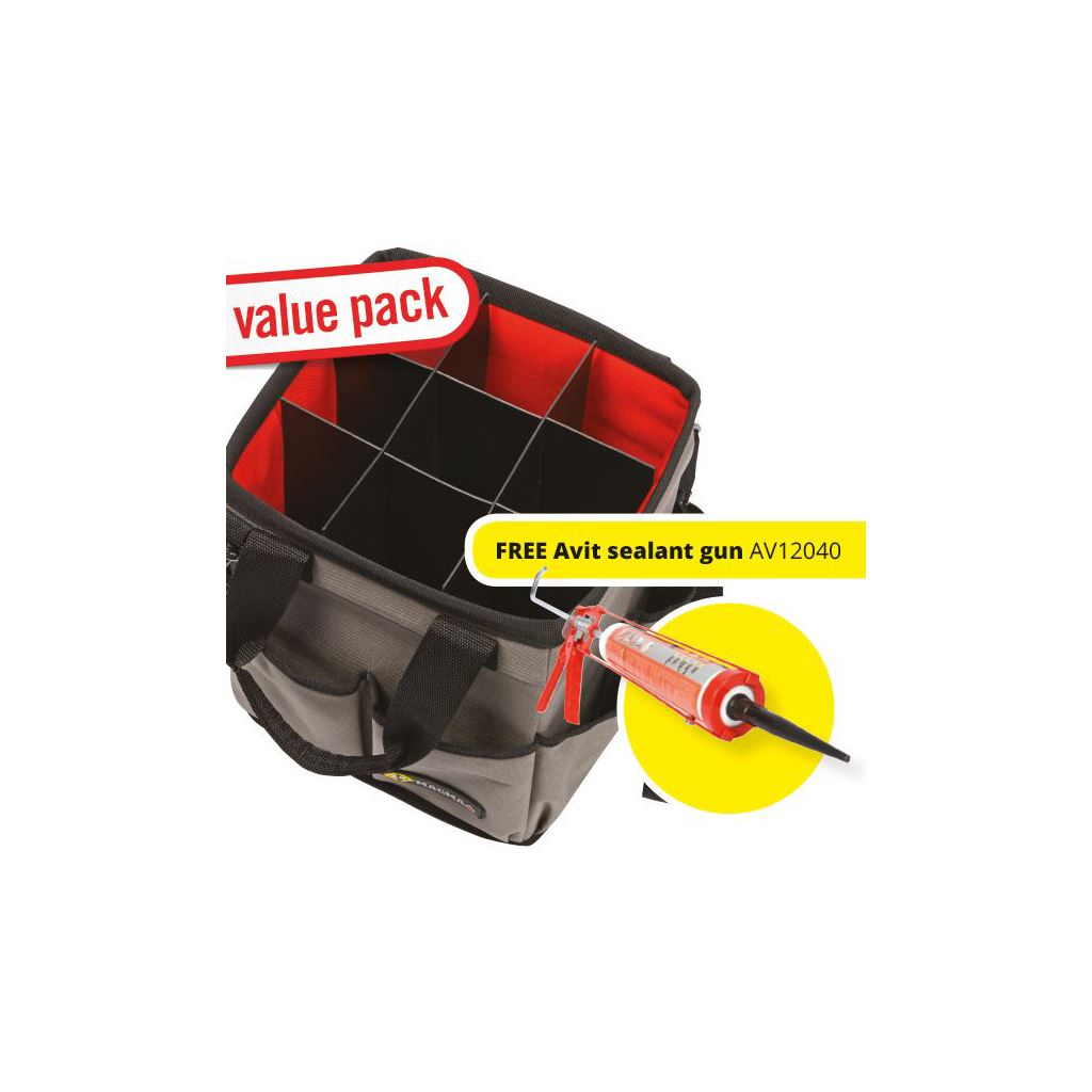 Unique three in one Tote for complete versatility. Folds flat for compact 'not in use' storage. Wipe clean removable base. 8 Vertical storage pockets for easy tool access. Padded shoulder strap for maximum comfort. Ingenious insert for storage of Silicon, glues, mastic and gun. Rugged polyester construction.