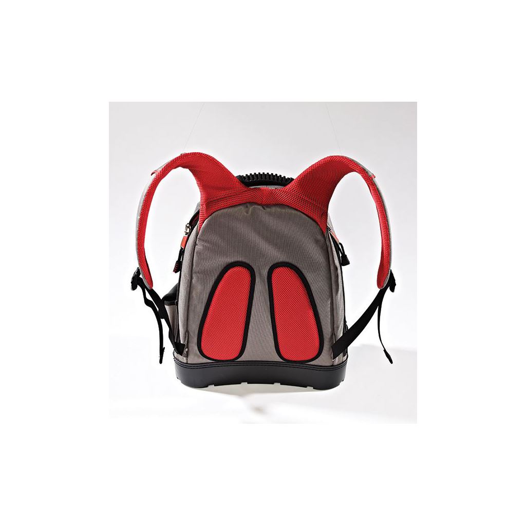 100% waterproof and crackproof polymer base. Lockable zip system for extra security on the move. Contoured shape base for additional comfort. Vertical storage pockets for easy tool access. Extra padding at the back and reinforced shoulder straps. 39 pockets and holders including space in the base for larger tools. Padded front pocket with internal zipped document pocket and holders