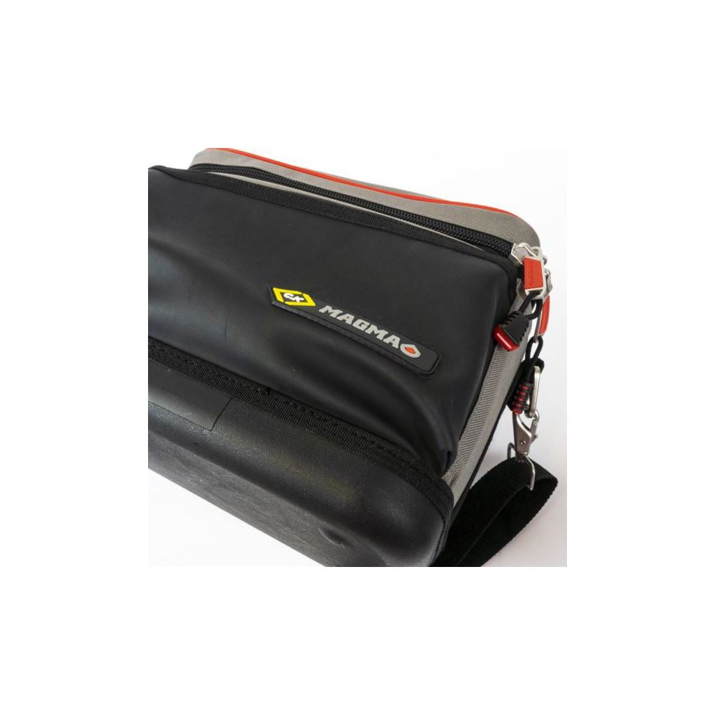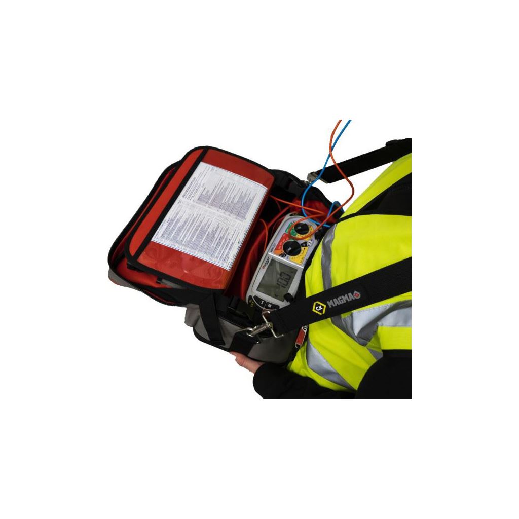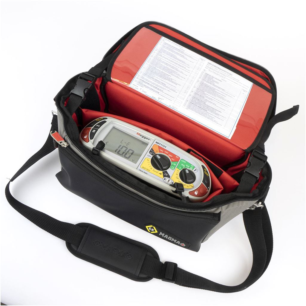 Improved access with easy-opening lid and two retaining straps. Adjustable padded compartments for safe storage of test equipment and accessories. 27 pockets and holders for extensive storage of test equipment, accessories and tools. Convenient toolkit storage compartment. Carrying handle and padded shoulder strap for maximum comfort. Heavy Duty lockable zip system for extra security. Hard protective devider between tools and test equipment. Integrated Trolley Strap, for easy transport with any Magma Wheeled Case. 100% Waterproof Polymer base for increased durability. Convenient see through document/instruction manual pocket. Dimenstions: 360 x 240 x 220 mm.