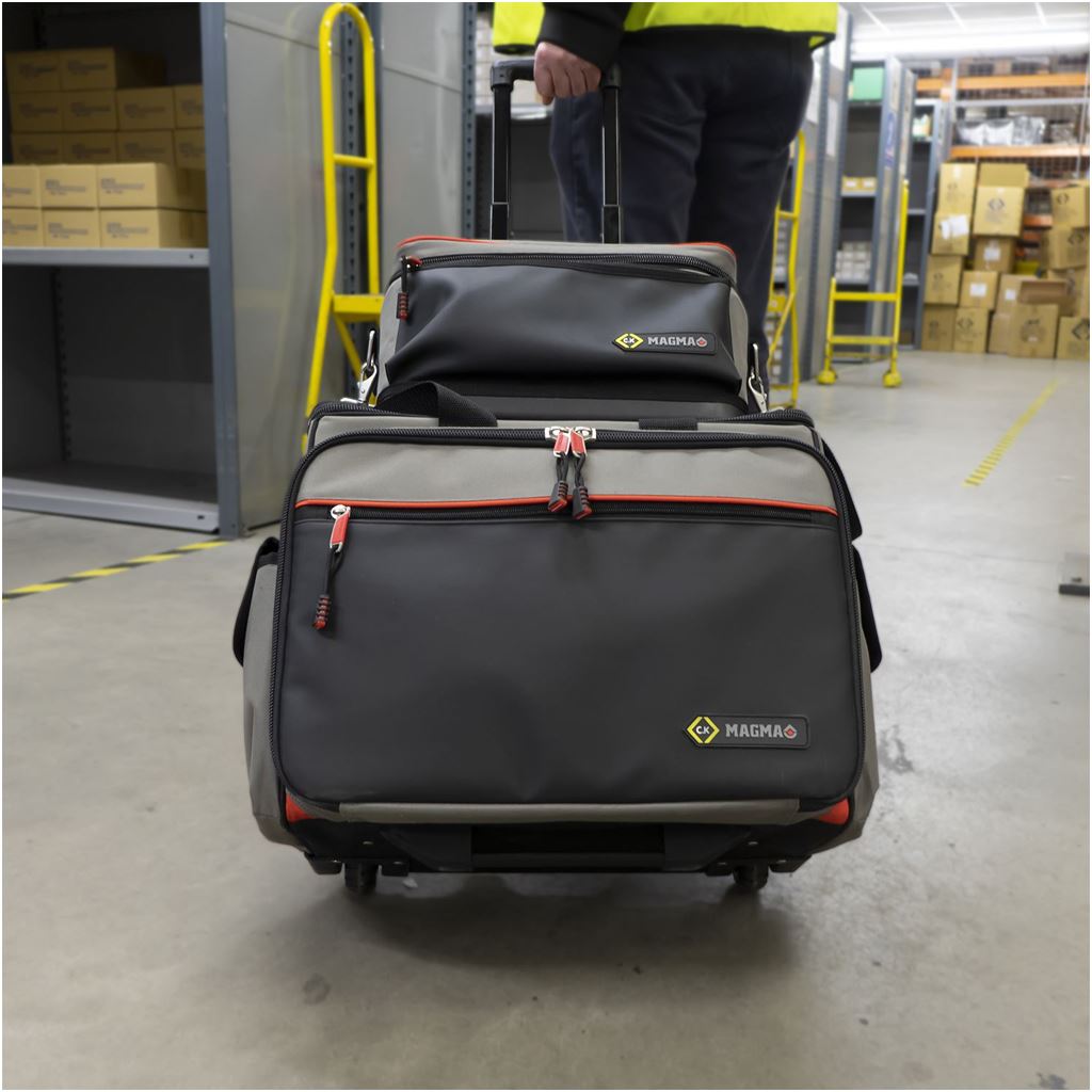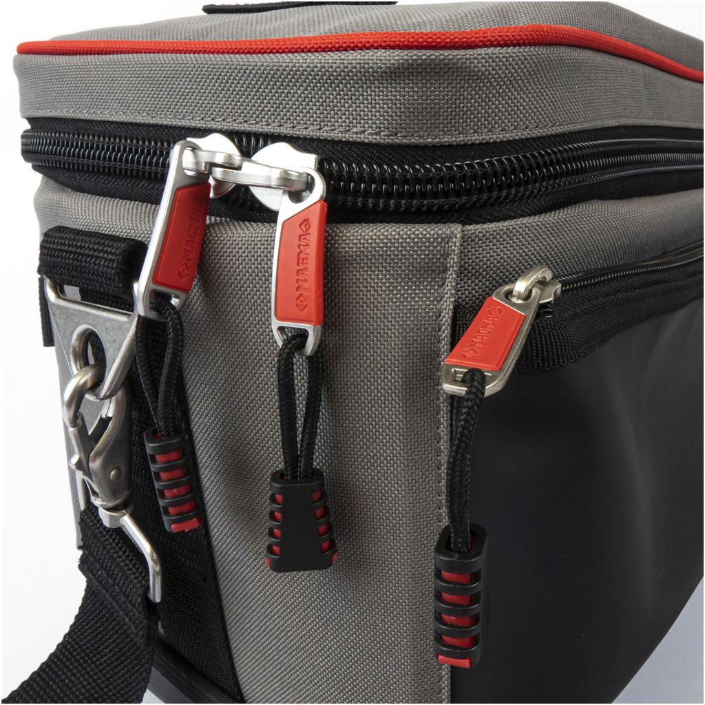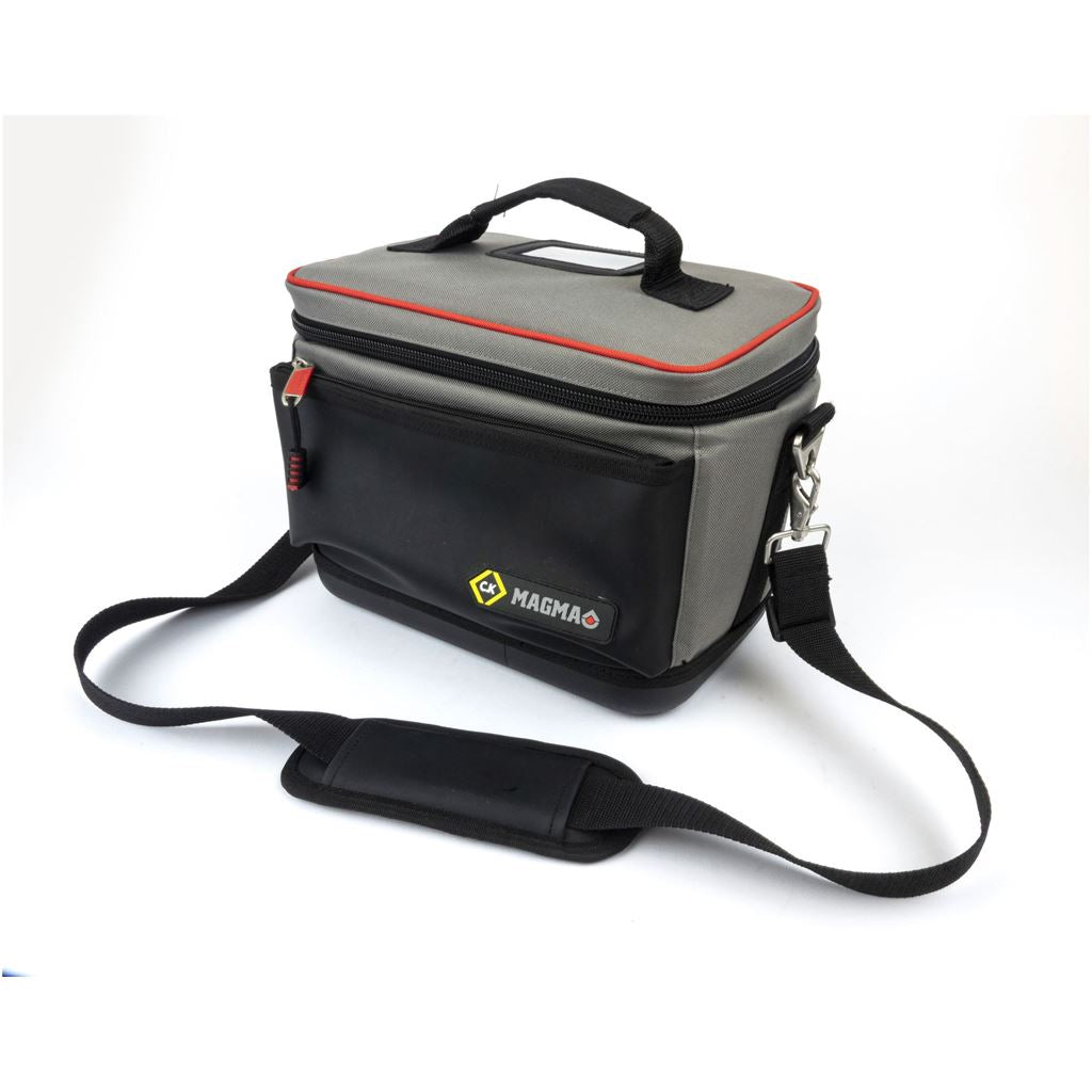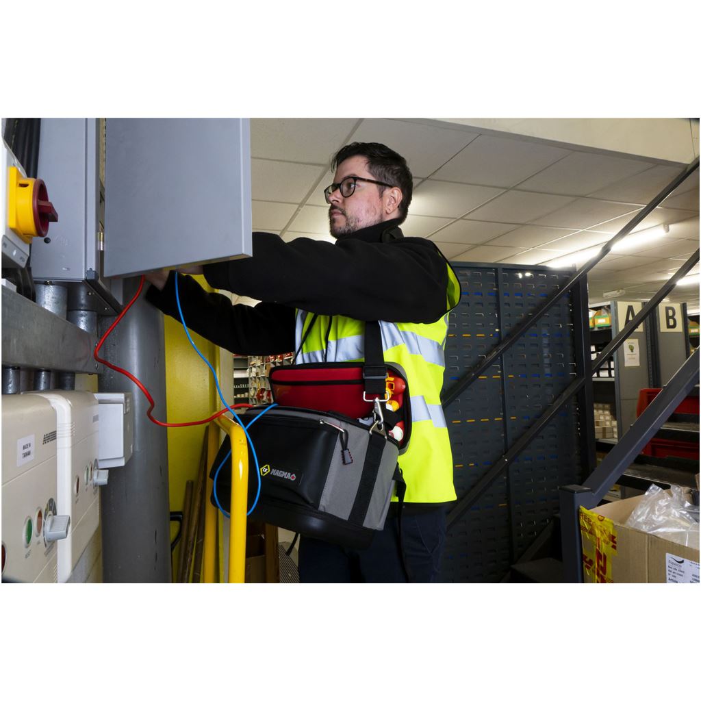 Improved access with easy-opening lid and two retaining straps. Adjustable padded compartments for safe storage of test equipment and accessories. 27 pockets and holders for extensive storage of test equipment, accessories and tools. Convenient toolkit storage compartment. Carrying handle and padded shoulder strap for maximum comfort. Heavy Duty lockable zip system for extra security. Hard protective devider between tools and test equipment. Integrated Trolley Strap, for easy transport with any Magma Wheeled Case. 100% Waterproof Polymer base for increased durability. Convenient see through document/instruction manual pocket. Dimenstions: 360 x 240 x 220 mm.