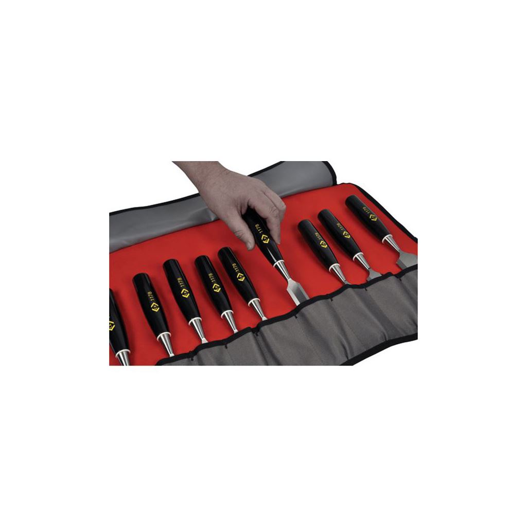 Durable polyester construction. Bright red inner lining for easy visibility of stored items. Stores up to 9 chisels. Padded handle.