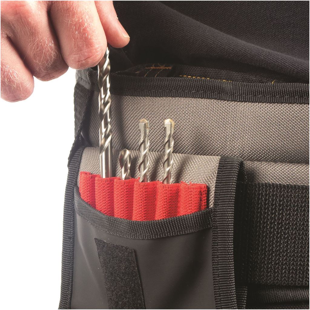 Universal design for right or left handed use . Constructed from heavy duty, tear-resistant polyester for Industrial performance. Velcro securing strap for all drill types . Secure and accessible drill and bit pockets