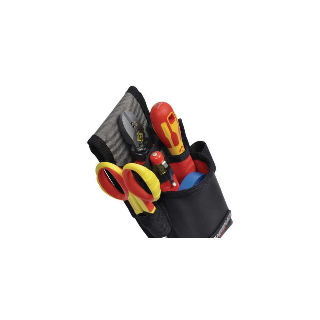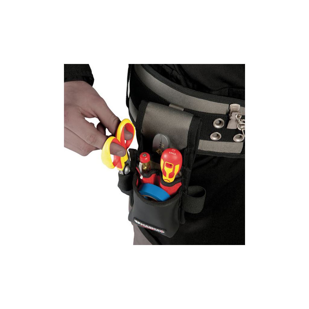 Durable polyester construction. Mini pouch for essential tools. Metal clip for strength and easy attachment/removal. 4 pockets & holders for tools & equipment.