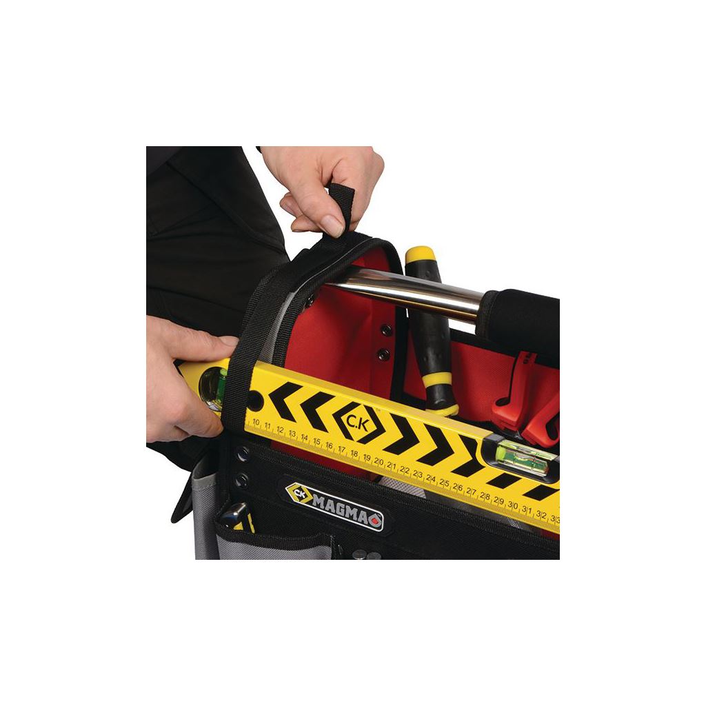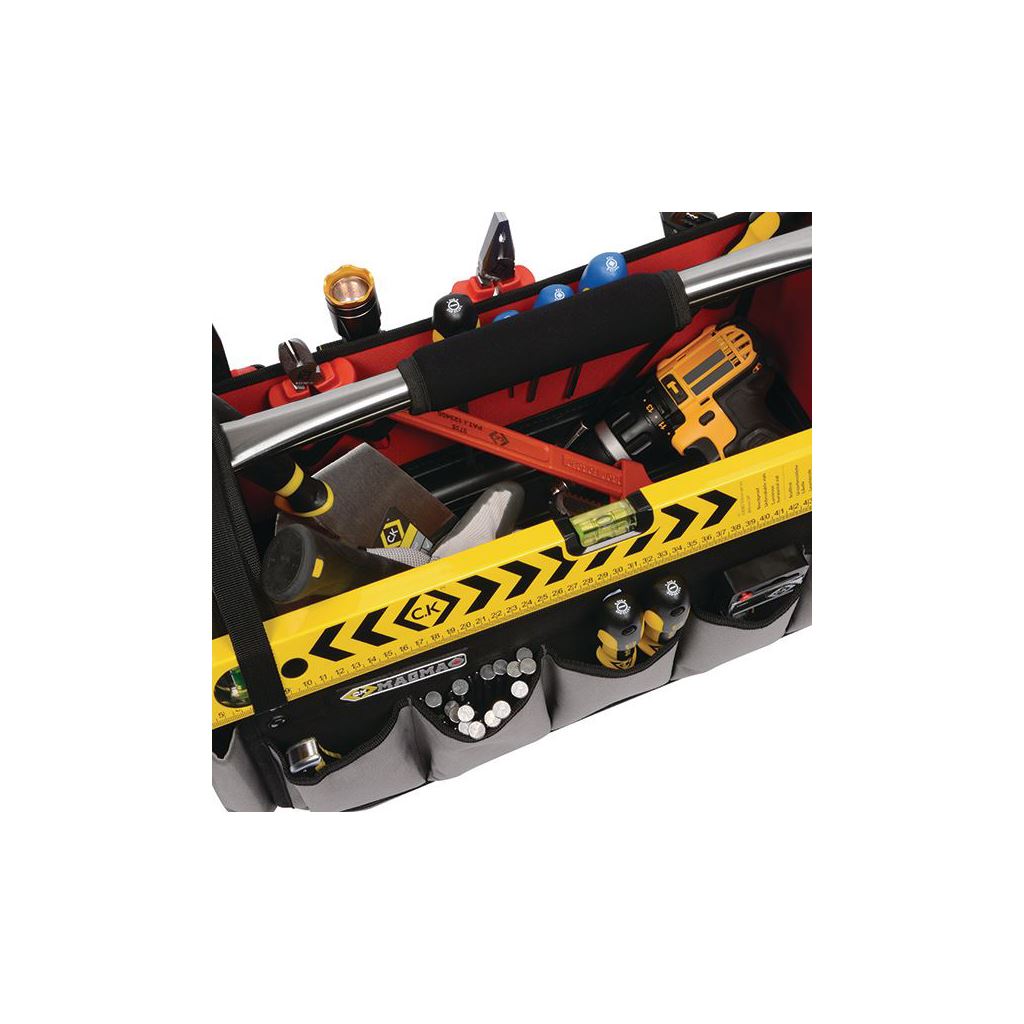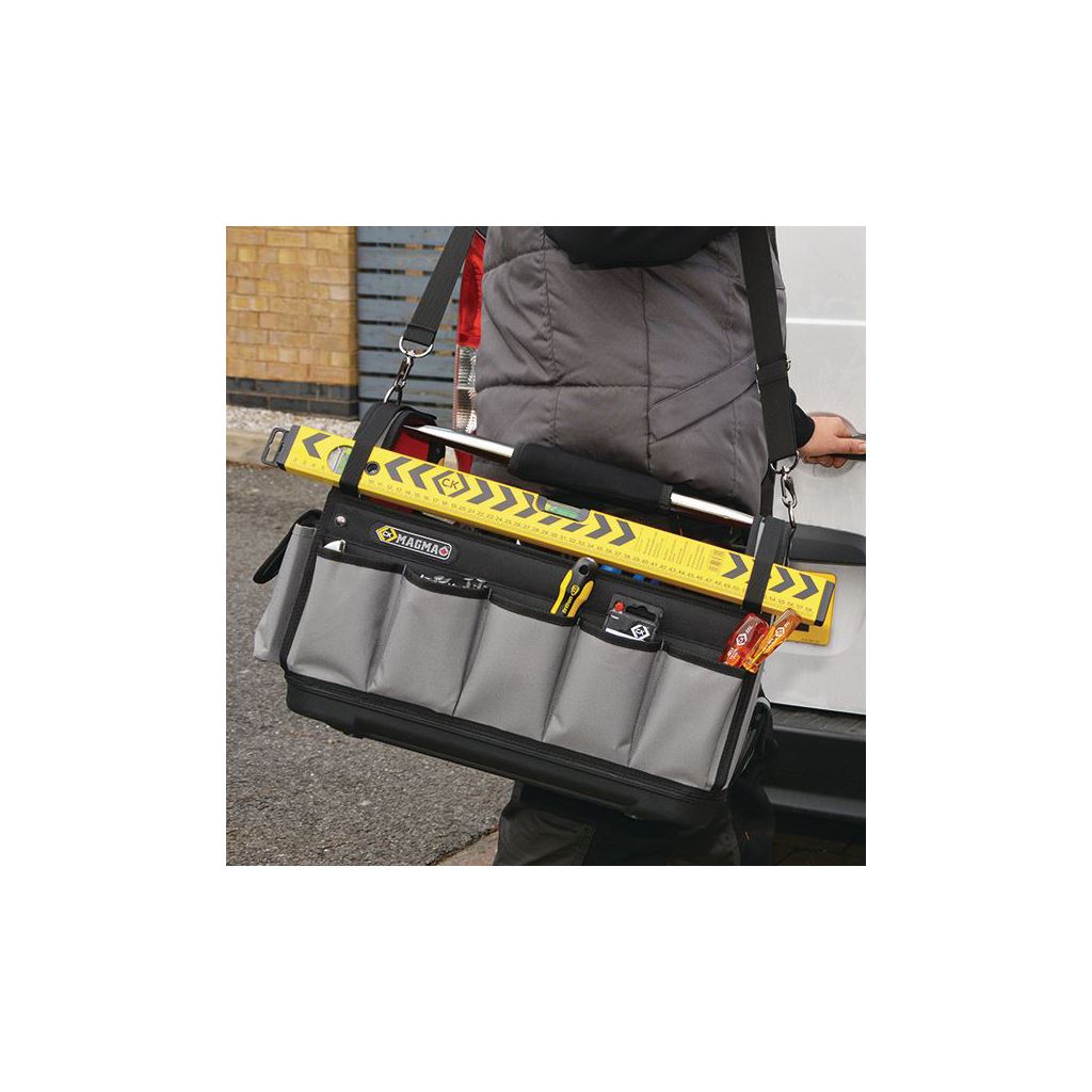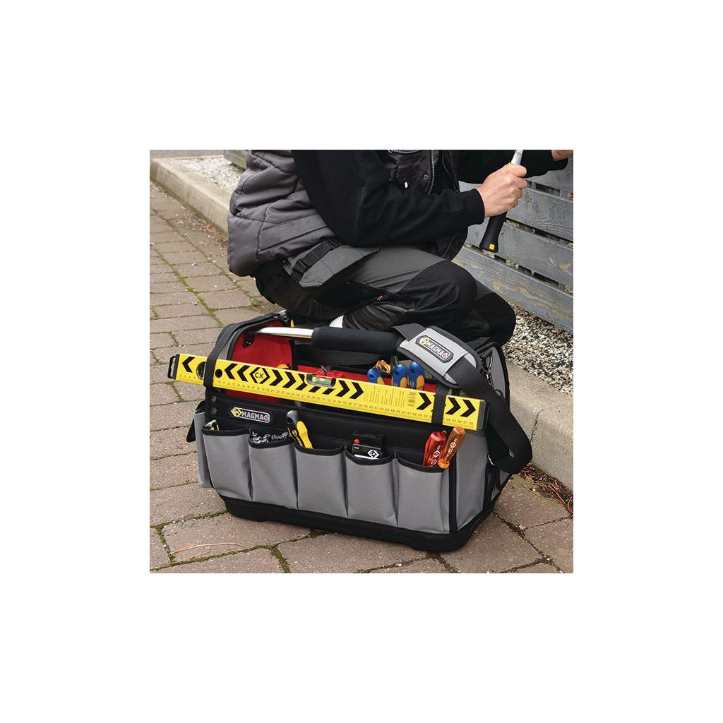 12 vertical storage pockets for easy tool access. 100% waterproof and crackproof polymer base. Rugged polyester construction. Rigid frame including a heavy duty steel handle bar. Padded shoulder strap for maximum comfort. Large internal storage area with 33 additional pockets and holders. Adjustable straps to secure an aluminium level. .
