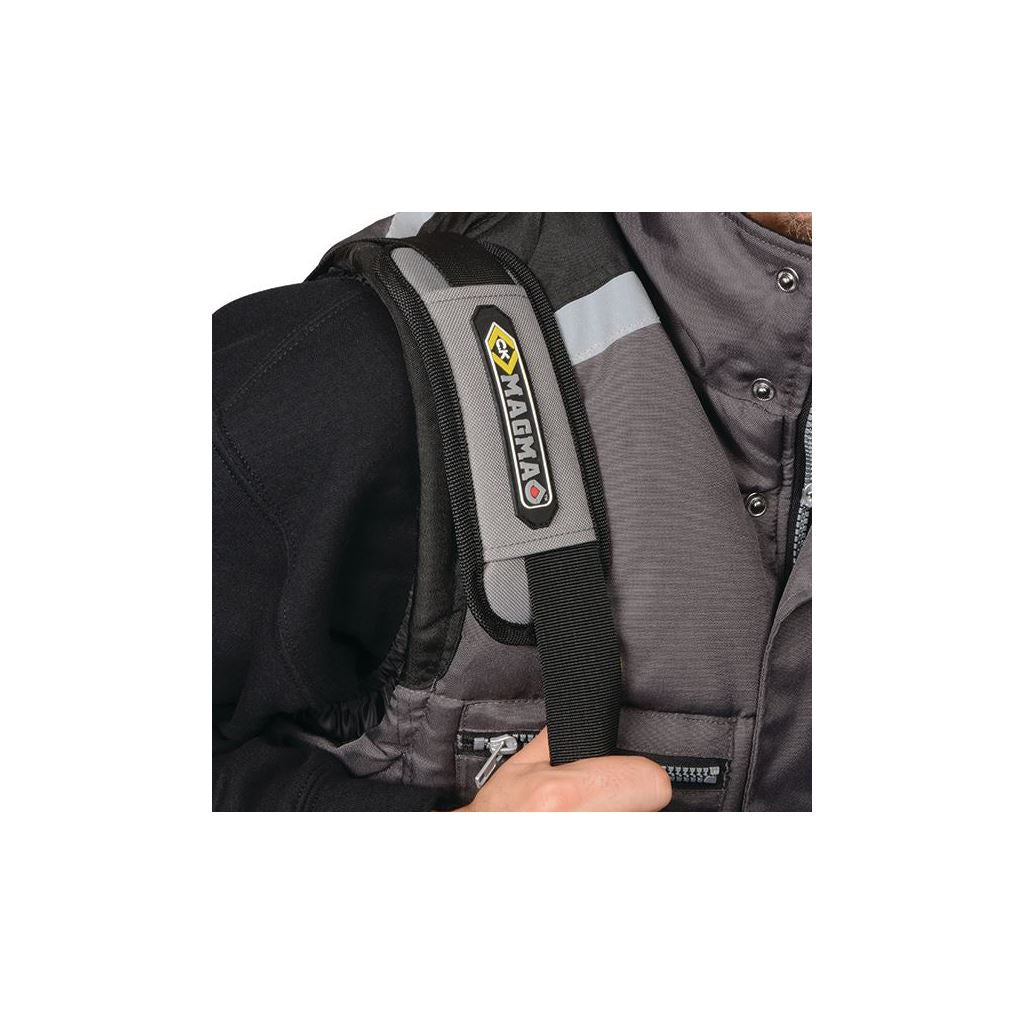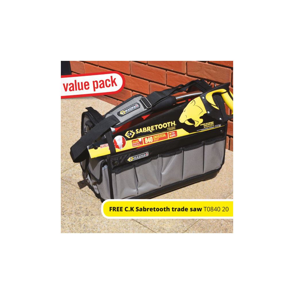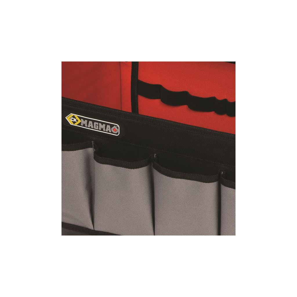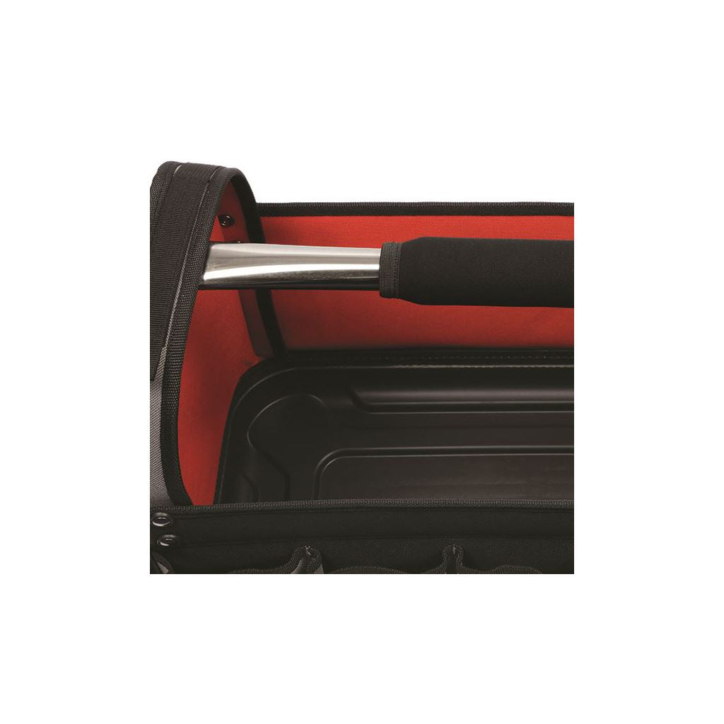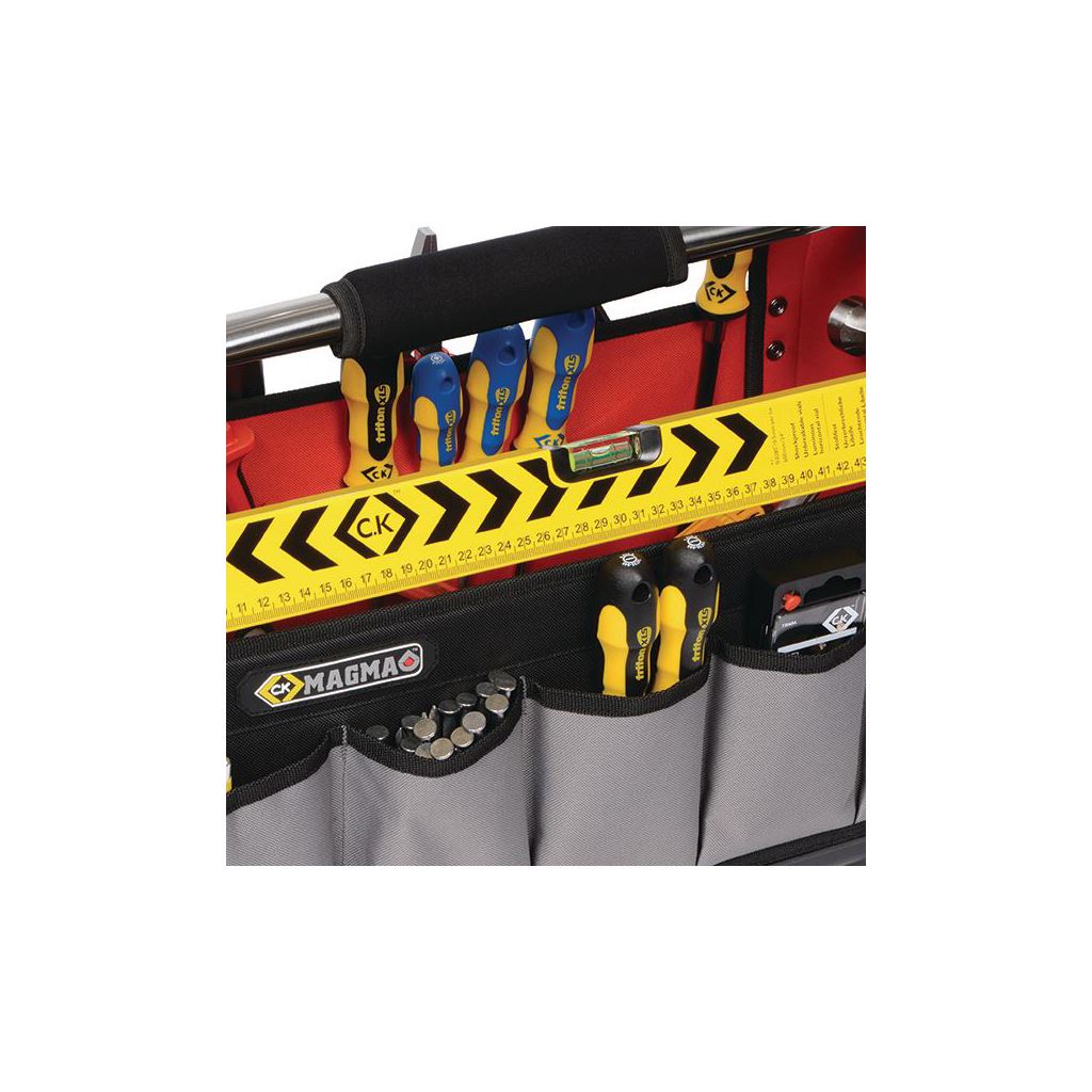12 vertical storage pockets for easy tool access. 100% waterproof and crackproof polymer base. Rugged polyester construction. Rigid frame including a heavy duty steel handle bar. Padded shoulder strap for maximum comfort. Large internal storage area with 33 additional pockets and holders. Adjustable straps to secure an aluminium level. .