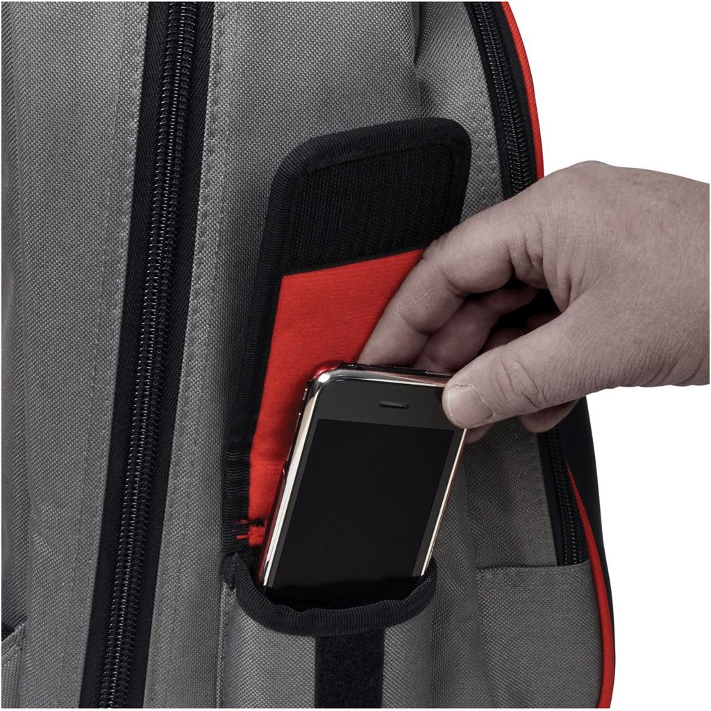 Durable polyester construction. Bright red inner lining for easy visibility of stored items. Mobile phone holder. Internal and external document pockets. 31 pockets and holders including fold out panels for easy tool access.