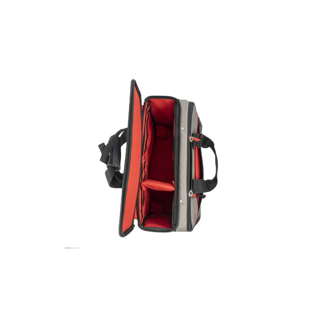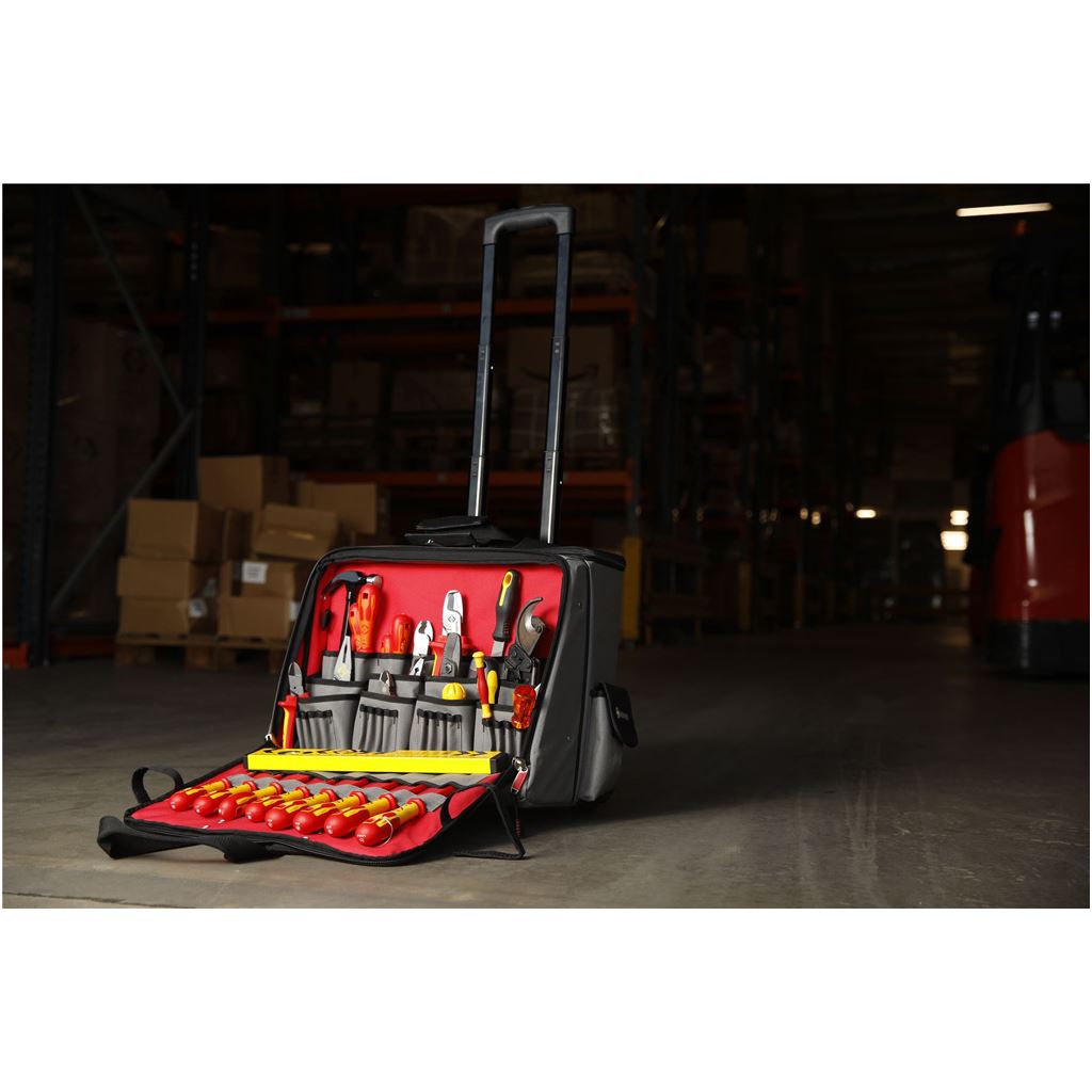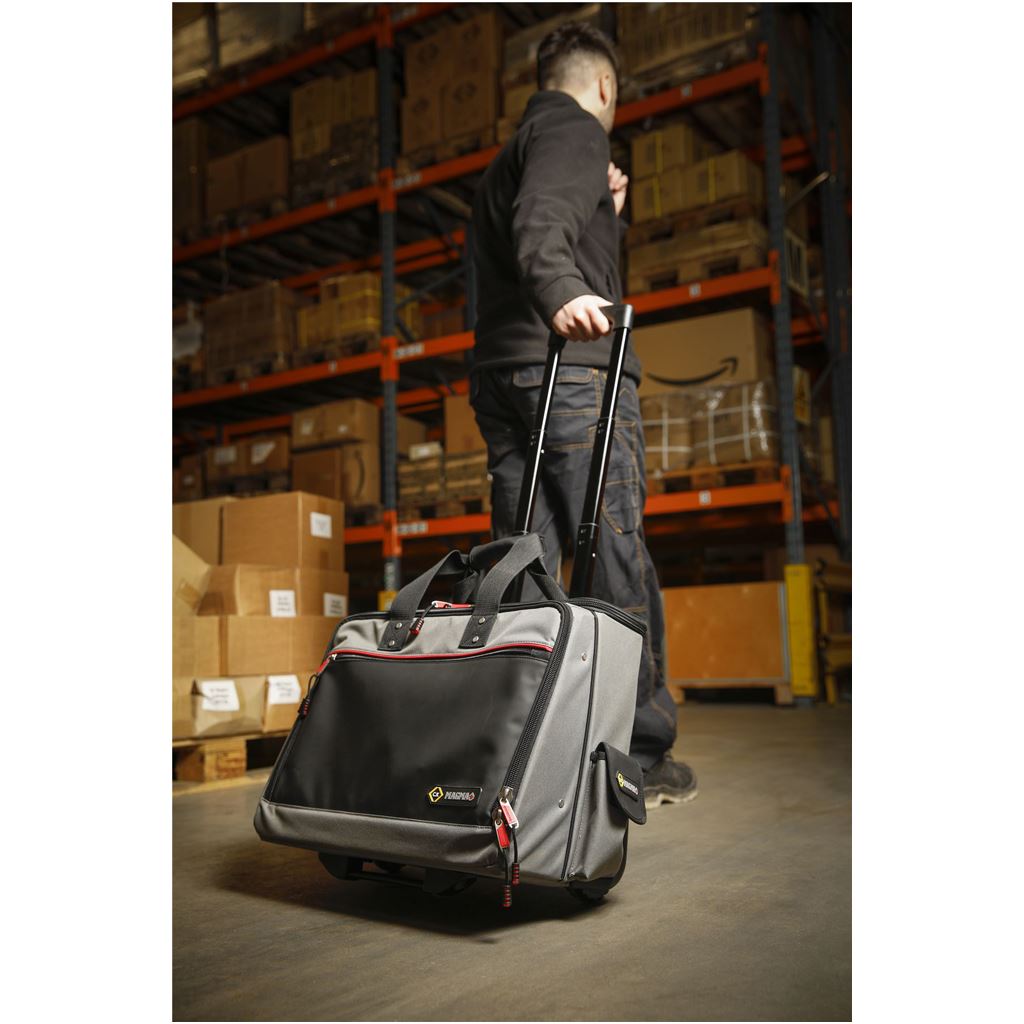 More storage than ever before 50 Pocket/Storage Compartments, Vertical Pockets for clear visibility and organisation of tools, Adjustable straps for easier access to main pocket compartment, Lockable zip system for extra security, Rugged and durable chassis, wheels and telescopic handle for all terrain use, Balanced design for effortless movement of larger toolkits, test equipment and power tools, Extra wide main compartment featuring a red lining for high visibility hard protective divider between tools and test equipment, Zip down front panel for A4 document storage