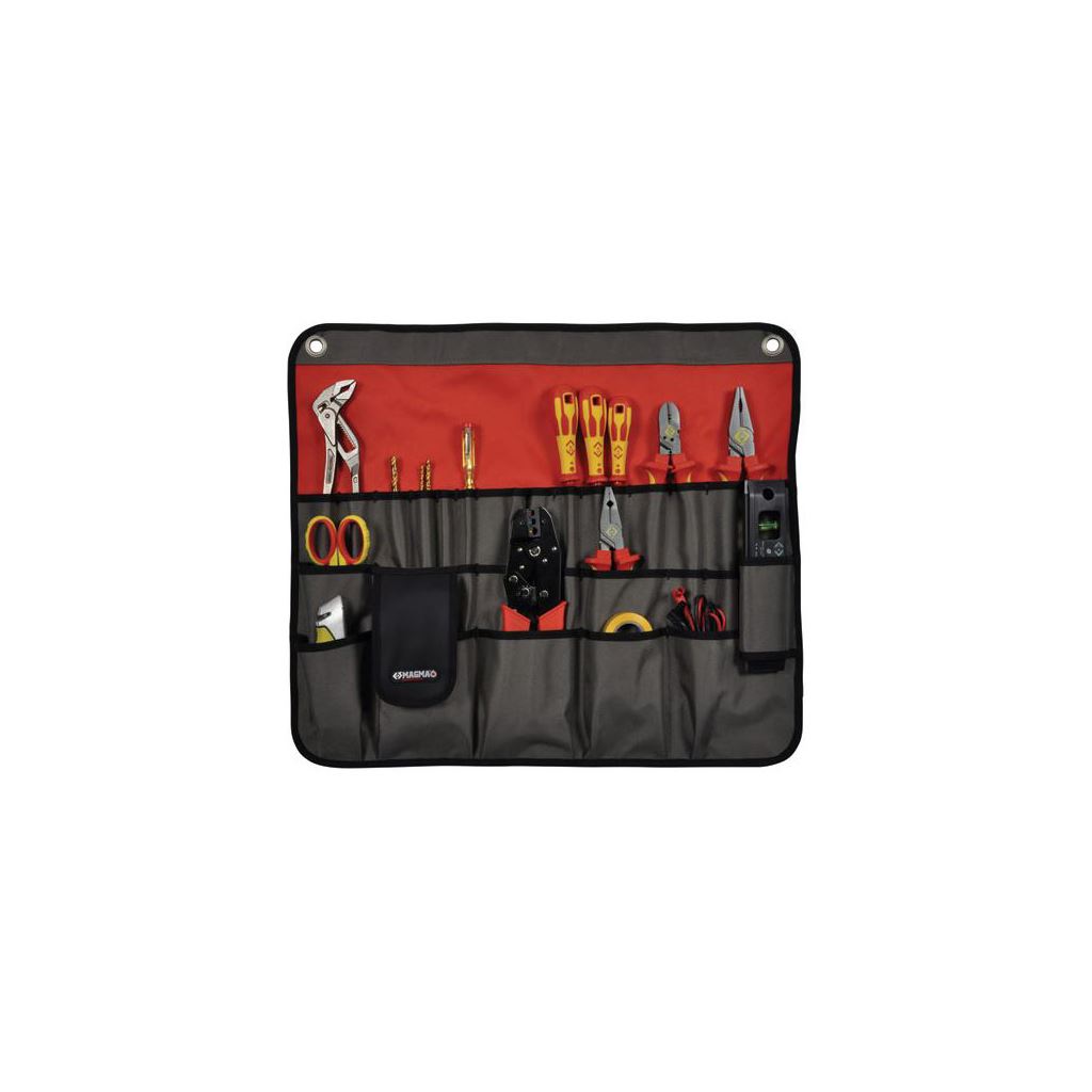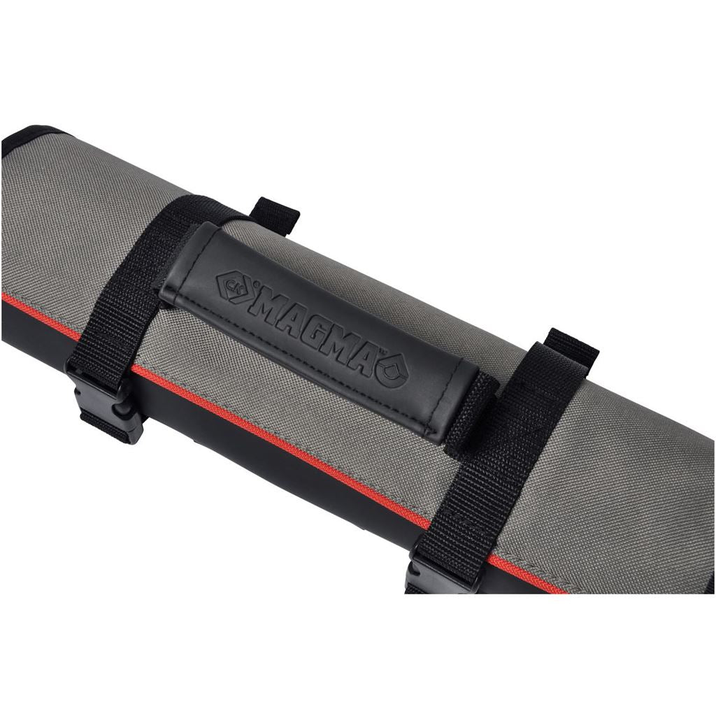Durable polyester construction. Bright red inner lining for easy visibility of stored items. 30 pockets to carry a range of tools. Can be used as roll or for wall hanging. Padded handle.