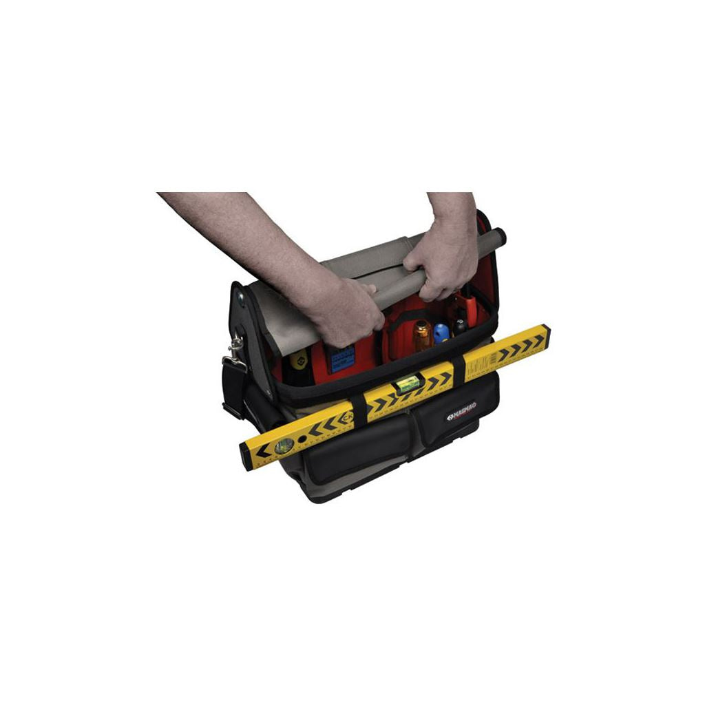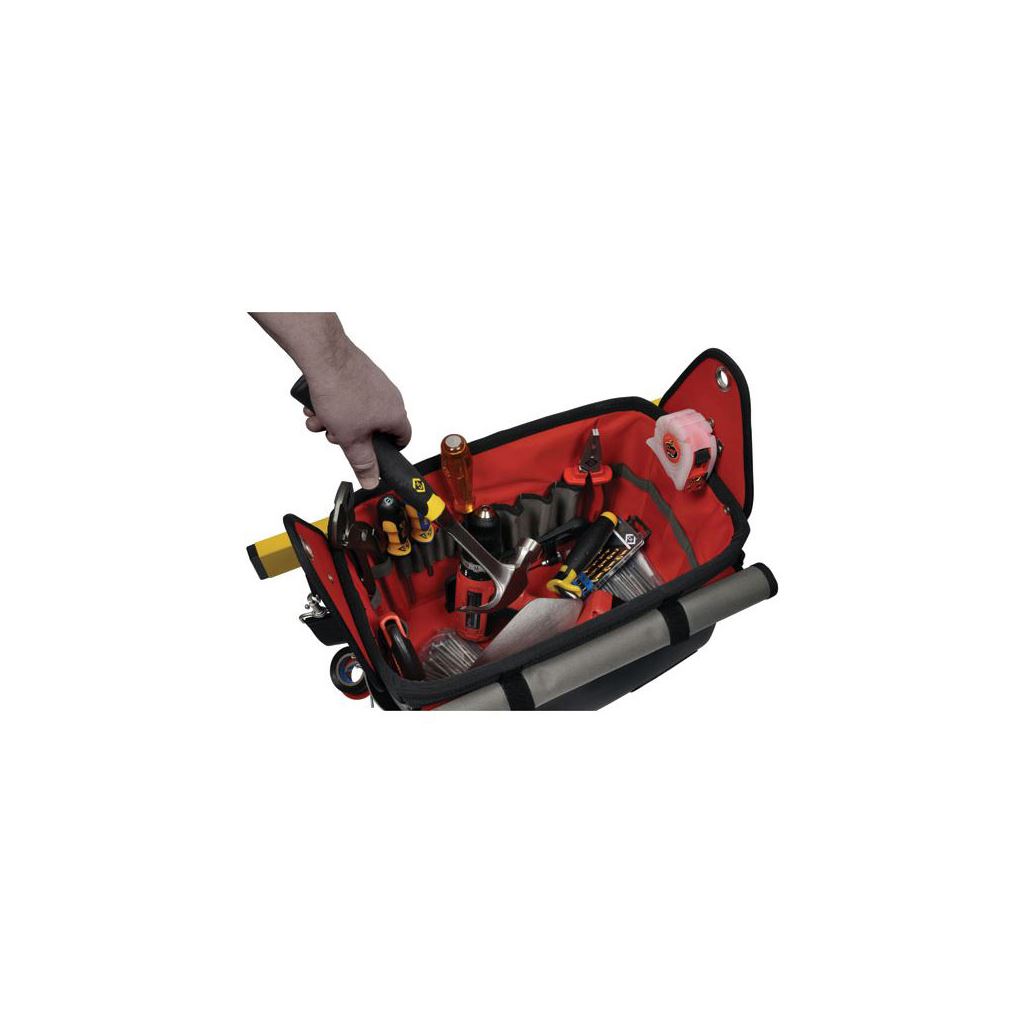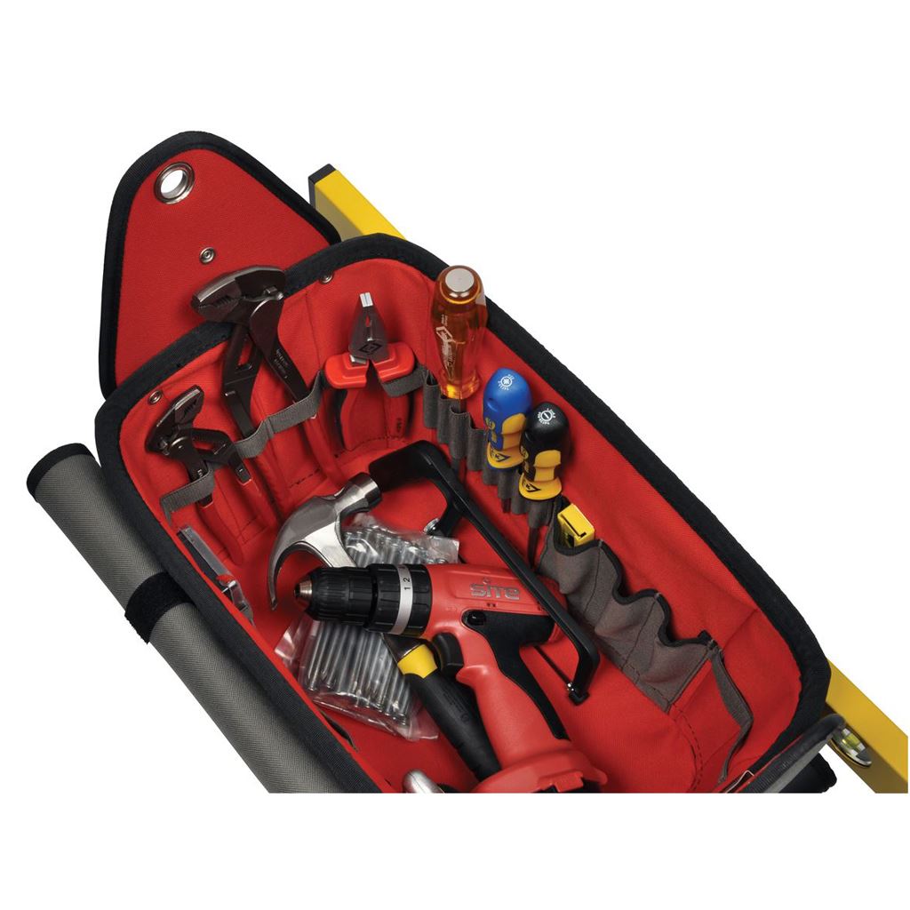 Durable polyester construction. Bright red inner lining for easy visibility of stored items. 100% waterproof and crackproof rubberised base. Convenient detachable handle and padded shoulder strap for maximum comfort. Roll-up cover. Large internal storage area with 32 additional pockets & holders.