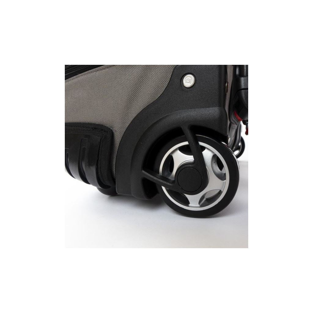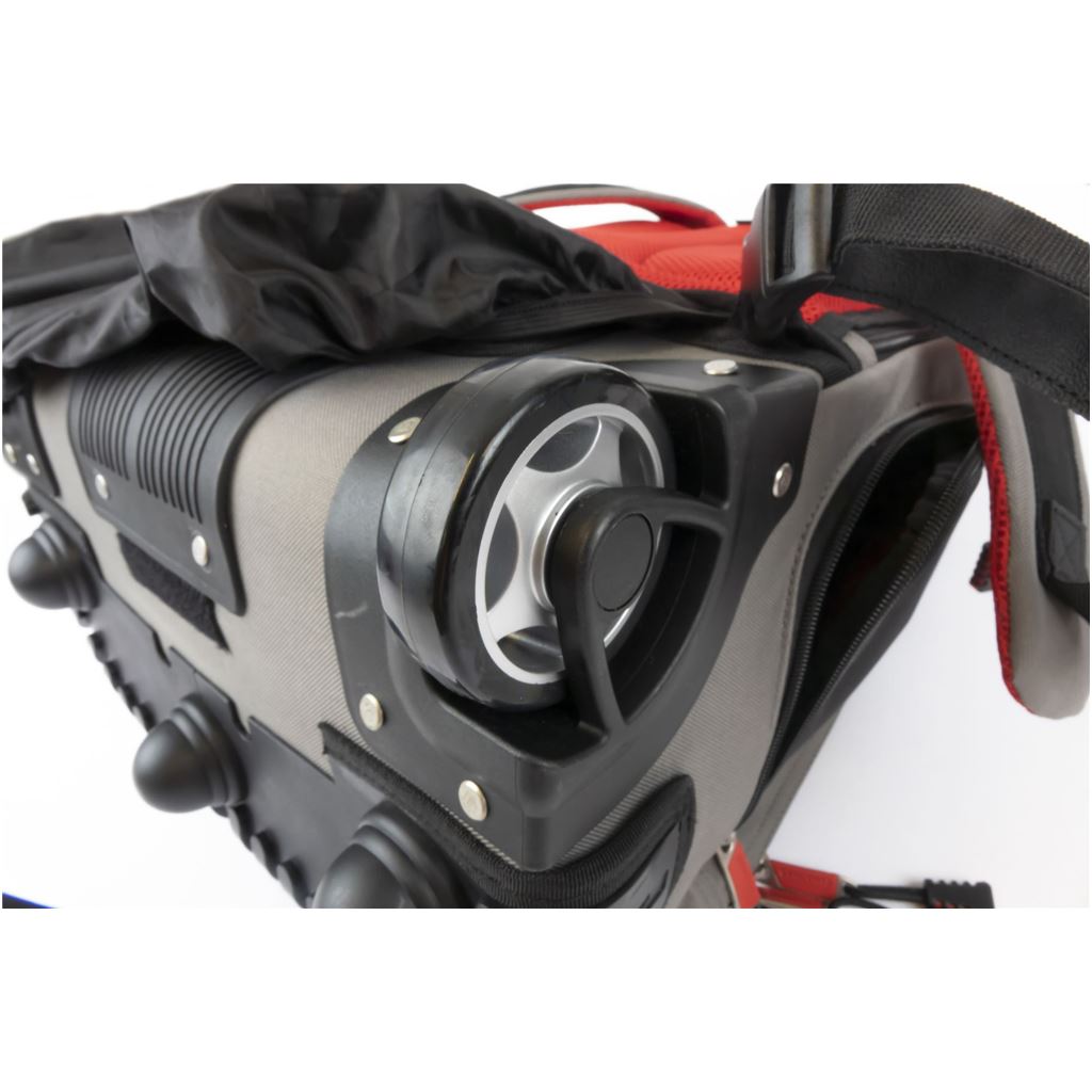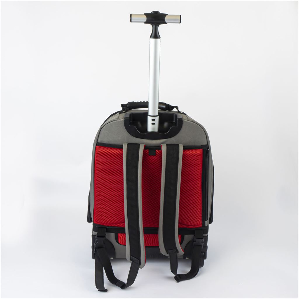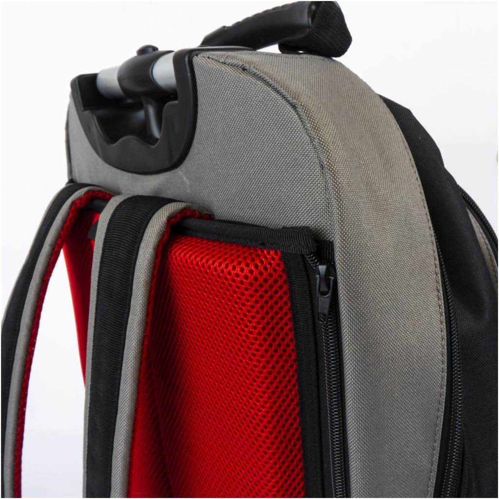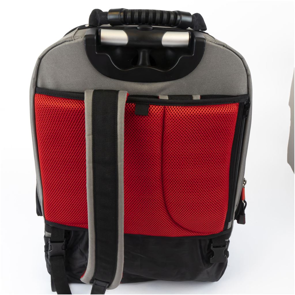 Convenient All-in-one rucksack and wheeled tool case:. ~ Rugged & durable chassis for all terrain use. ~ Extra comfort padding with storable shoulder straps. ~ Vertical pockets for easy tool access. ~ Balanced design remains upright when fully open. ~ Removable wheel cover to protect clothing. ~ Durable polymer base