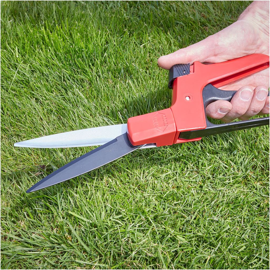 One handed operation shears with blades that can be rotated to either horizontal or vertical position for maximum convenience. One blade chrome plated and the other non stick coated for rust resistance and low friction operation. Secure safety catch.