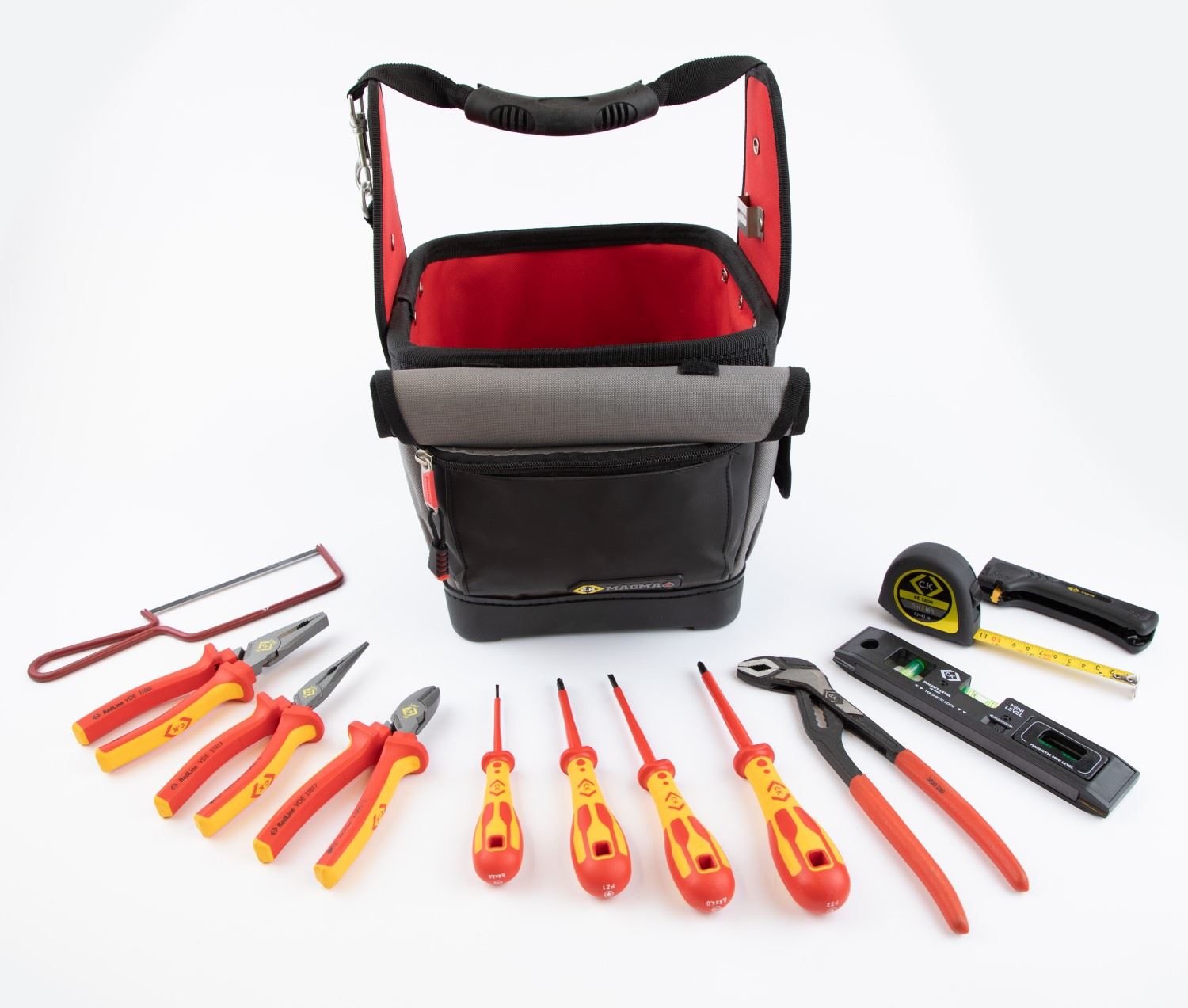 A flexible selection of tools for general maintenance and repair. Lightweight open tote provides versatile and spacious tool storage. Convenient all-in-one cable stripper to tackle a variety of electrical fixes. Waterpump pliers for plumbing installations and repair. CONTENTS:. . MA2633. Magma Technician's Tote. 431017. RedLine VDE Side Cutters 160mm. 431002. RedLine VDE Combination Pliers 185mm. 431013. RedLine VDE Snipe Nose Pliers 175mm. T49143-1. DextroVDE Screwdriver PZD1x80mm. T49143-2. DextroVDE Screwdriver PZD2x100mm. T49144-025. DextroVDE Screwdriver Slotted Parallel 2.5x75mm. T49144-040. DextroVDE Screwdriver Slotted Parallel 4.0x100mm. T3650 250. Waterpump Pliers 250mm. T1270. Universal Cable Stripper. T3442 16. Softech Tape 5m/16'. T0834. Junior Hacksaw. T3482. Pocket Level