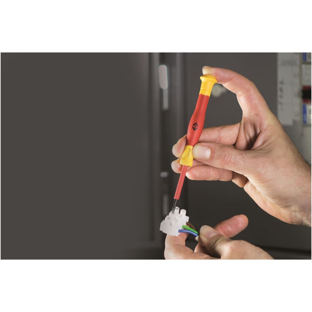 Designed to turn the smallest of screws with ease, the new C.K VDE Precision screwdriver combines the control of a rotating cap with the safety of VDE approval. ERGONOMICALLY DESIGNED HANDLE WITH HOLLOW ROTATING CAP FOR EASE OF USE & PRECISE CONTROL. PREMIUM QUALITY CHROME VANADIUM STEEL BLADE FOR EXCEPTIONAL STRENGTH & DURABILITY. PRECISION MACHINED, MAGNETIC TIPS FOR AN EXACT SCREW FIT & DAMAGE FREE SCREWDRIVING. VDE APPROVED - INDIVIDUALLY TESTED TO 10,000V FOR SAFE LIVE WORKING UP TO 1,000V