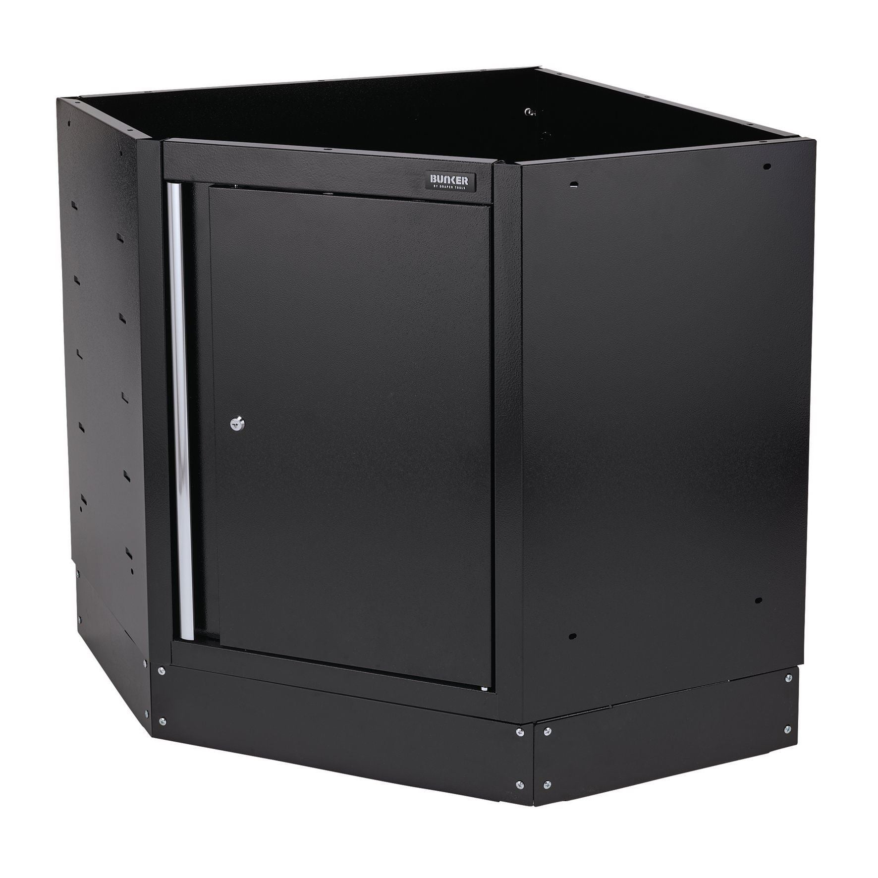 Part of the BUNKER; modular storage system. This stunningly designed premium-quality steel unit offers excellent storage space accessible by one cupboard door with an aluminium handle. The adjustable shelf inside allows for a more versatile use of space. The feet of the cabinet are adjustable for optimal positioning on an uneven floor. The cabinet's stylish matt black textured finish is highly durable, thanks to the industrial powder coating that protects against scratches, wear and corrosion. It has an integral lock for security and is supplied with two keys. The cabinet is delivered fully assembled and measures W 865 x H 910 x D 861mm. It can be used as an individual storage cabinet in conjunction with either a corner stainless steel or hardwood worktop as part of the BUNKER; modular storage system, which includes 24 clever modular options. It comes supplied with all the required fittings for simple installation. For your quality assurance, all BUNKER; units include a 10-year warranty.