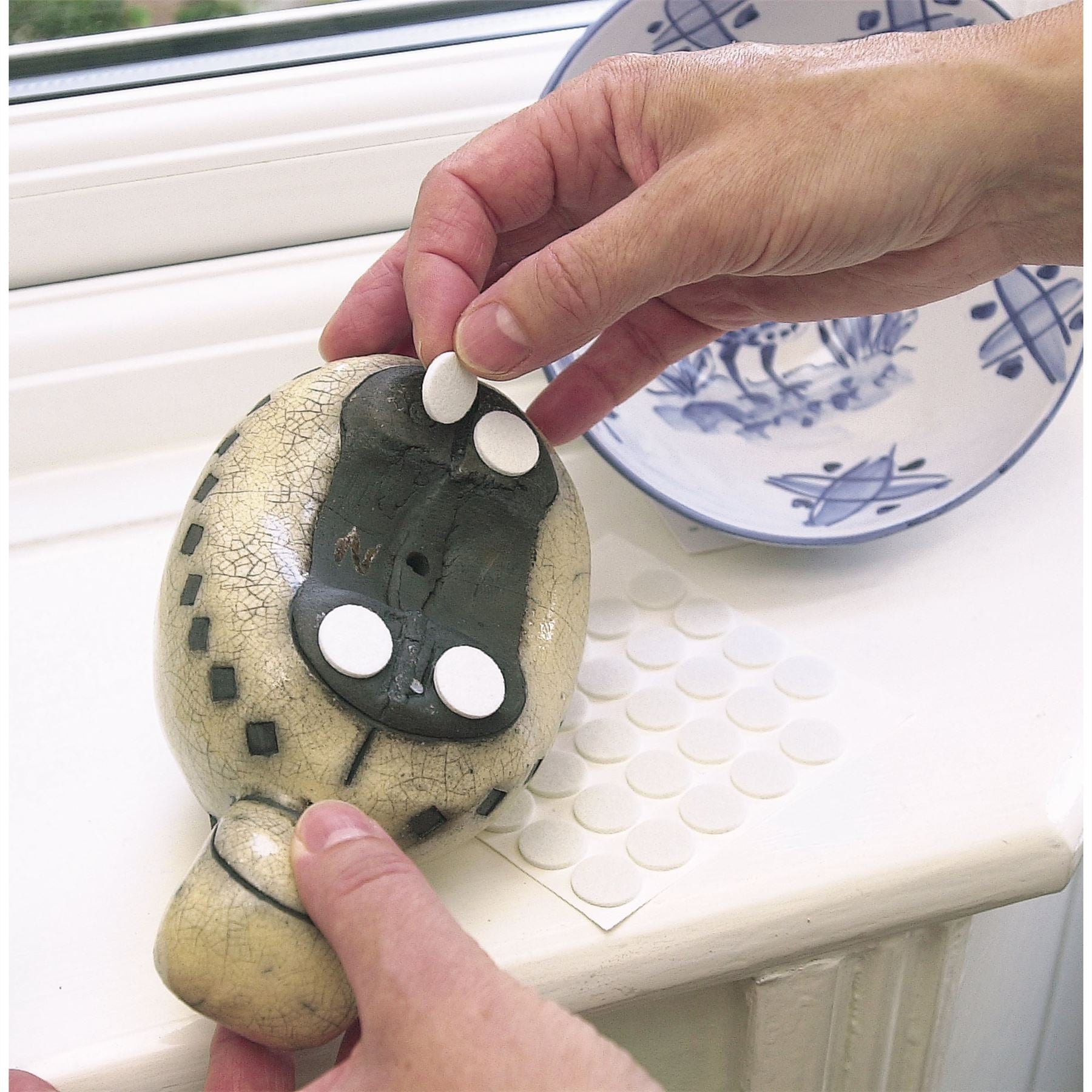 EVA pads with adhesive backing for protecting furniture surfaces, worktops, parquet and laminate flooring etc. Five sizes available. Display packed.