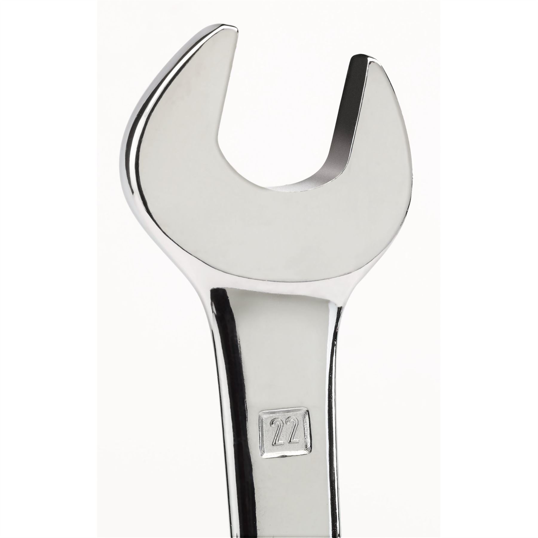 Expert Quality, with Draper Expert HI-TORQ deep offset ring end cranked at 15. Open end set at 15. Long pattern forged from chrome vanadium steel, hardened, tempered, chrome plated and fully polished throughout. Display packed.