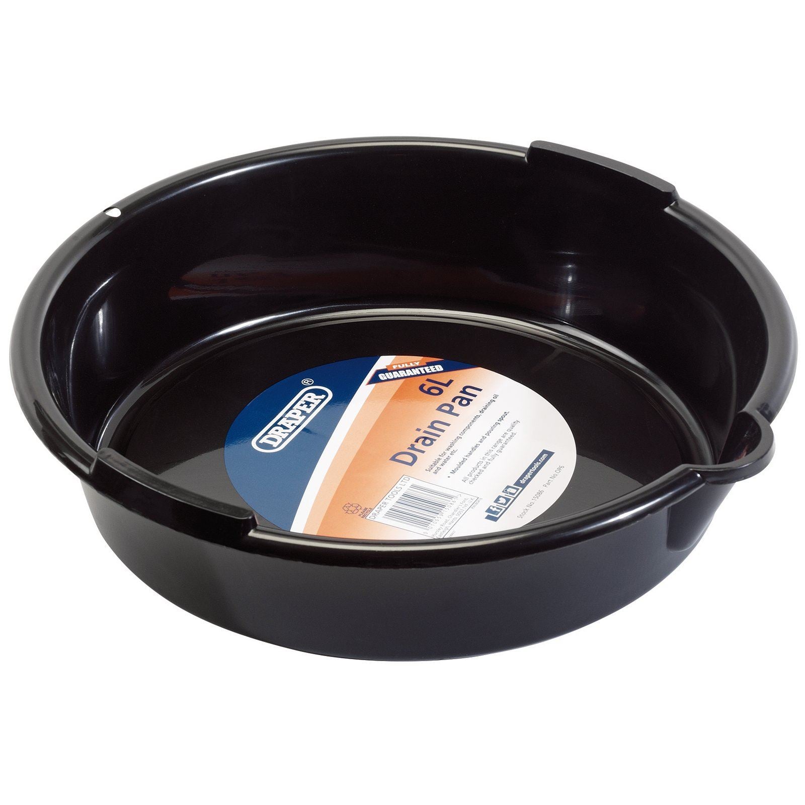 6 - litre draining pan, suitable for vehicle fluid changes. Manufactured from strong and durable plastic with moulded handle grips and a pouring spout for easier emptying of fluids into a dedicated recycling container. Ideally suited for both the DIY user and professional mechanic.