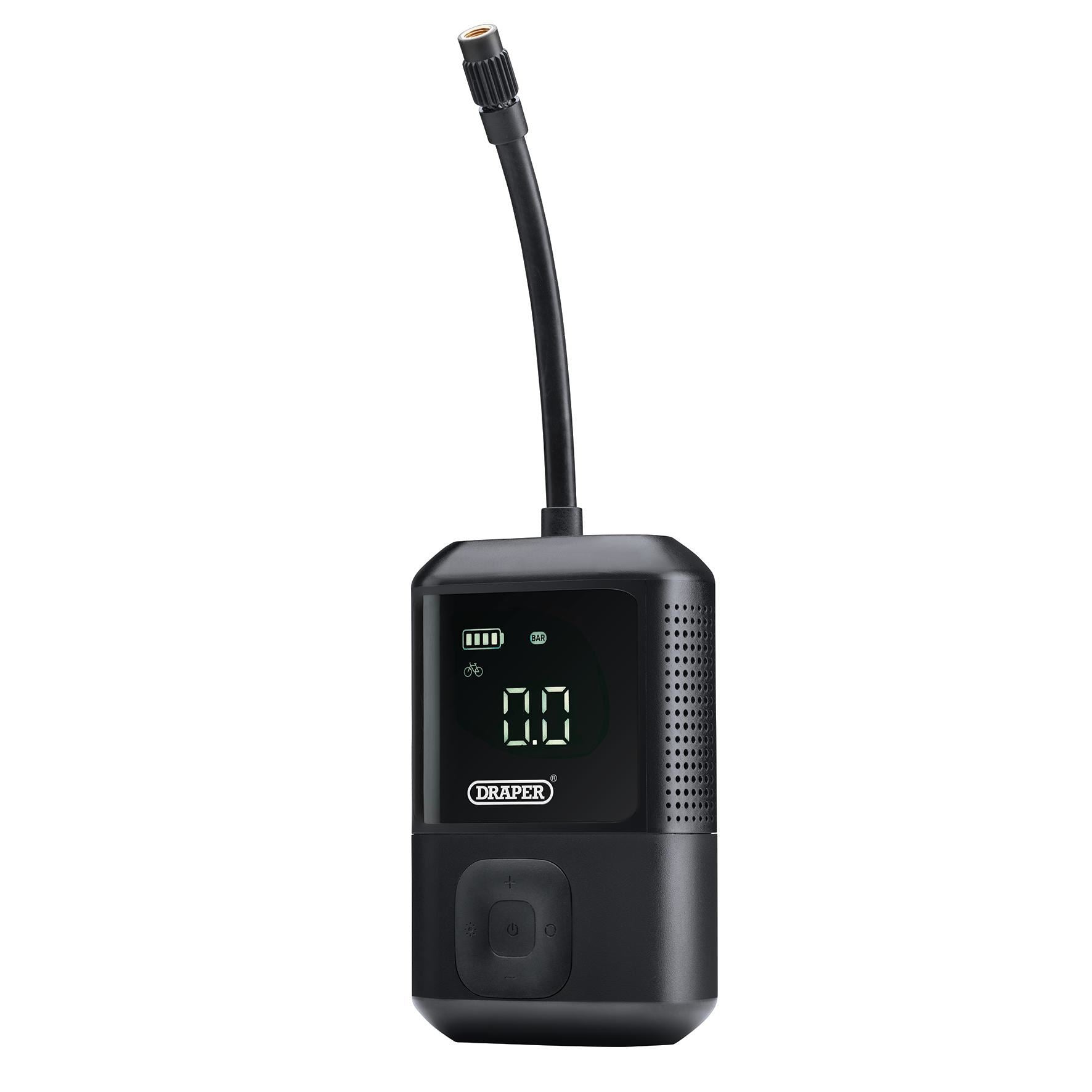This portable air compressor features a large digital LED gauge that shows pressure in PSI, BAR, and KPA. It has four preset inflation modes for car, motorbike, bicycle, and ball, as well as a manual mode for setting custom pressure values. The compressor is suitable for inflating most vehicle tyres, including cars, bicycles, motorcycles, light commercial vehicles, and 4x4s. It comes with an accessory kit containing an air hose and inflation nozzles, making it useful for inflating airbeds, paddling pools, and footballs. Additionally, it features an integrated LED torch with constant beam, slow flashing/SOS, and fast flashing/strobe modes. The compressor is powered by a lithium-ion battery and can be recharged in 2 hours using the provided USB-C cable. It is conveniently sized for portability and comes with a canvas storage bag for keeping all the components together.