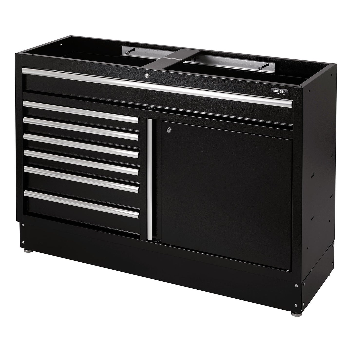 Part of the BUNKER® modular storage system. This stunningly designed premium-quality steel unit has seven drawers embellished with stylish aluminium handles. Each drawer has a smooth soft-close operation and is lined with lush foam to protect your tools. There is a cupboard offering excellent storage space with an adjustable shelf, accessible by a single cupboard door with aluminium handle. The feet of the cabinet are adjustable for optimal positioning on an uneven floor. The cabinet’s matt black textured finish is highly durable, thanks to the industrial powder coating that protects against scratches, wear and corrosion. It has an integral lock for security and is supplied with two keys. The cabinet is delivered fully assembled and measures W 1360 x H 910 x D 468mm. It can be used as an individual storage cabinet in conjunction with either a stainless steel or hardwood worktop or as part of the BUNKER® modular storage system, which includes 24 clever modular options. It comes supplied with all the required fittings for simple installation. For your quality assurance, all BUNKER® units include a 10-year warranty.