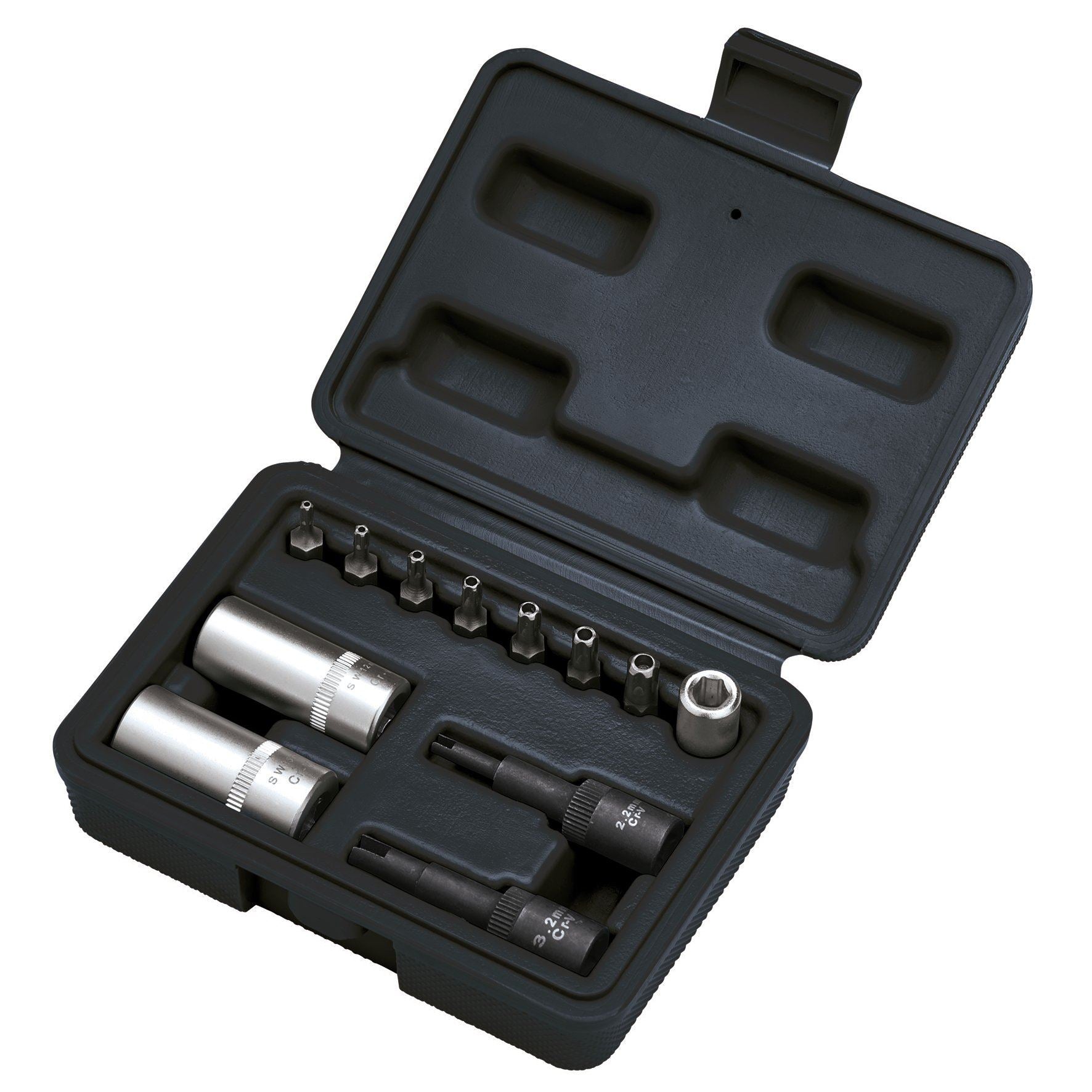This air conditioning and ECU tool kit is designed for removing plastic valve caps and valve cores during servicing and repairs on air conditioning systems in Audi, Volkswagen and Vauxhall/Opel vehicles. The kit includes tamperproof bits for use on ECU, airflow, mass sensors and injection pumps. Made from chrome vanadium steel, the components have a black phosphate finish for corrosion protection, except the SW12mm and SW15mm sockets, which have a satin chrome finish. Supplied in a sturdy plastic storage case.
