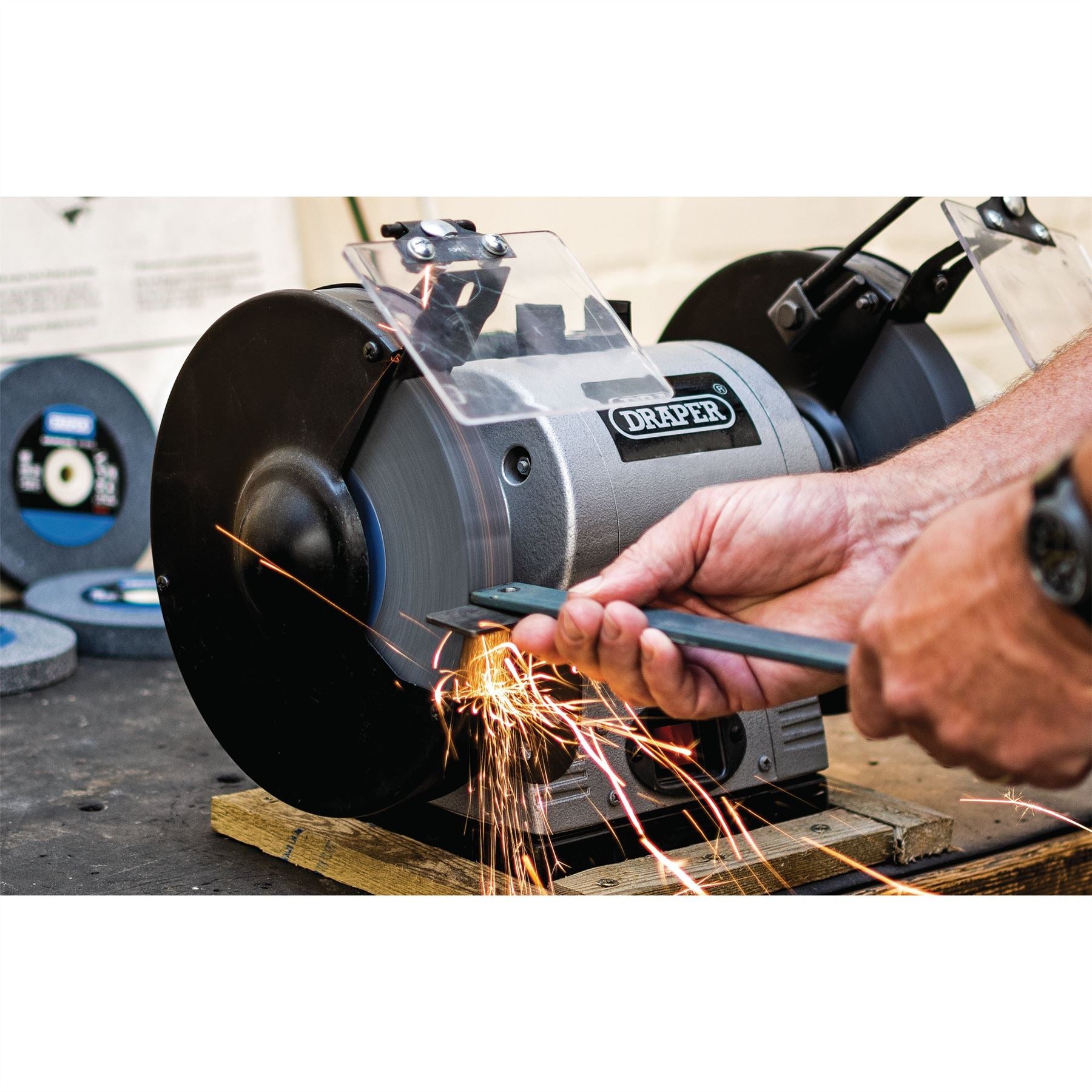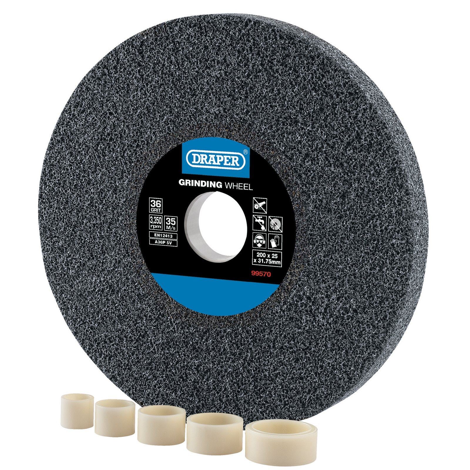 A high-quality, hard-wearing aluminium oxide bench grinding wheel with coarse grit. Suitable for general grinding, deburring and tool sharpening on non-ferrous metals and steel. Dry-cutting use only. Manufactured with a 31.75mm bore and supplied with 5 reduction rings enabling each bench grinding wheel to fit most bench grinders with a bore size between 12.7 – 31.75mm. Compatible with Draper Bench Grinders: 29621, 05097.
