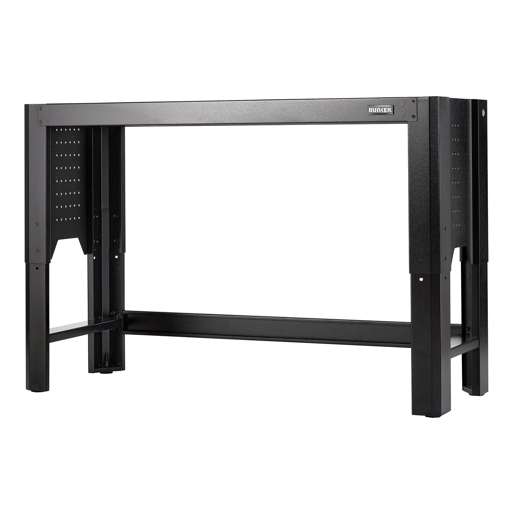 Part of the BUNKER& modular storage range. This tough premium-quality steel workbench frame has an industrial matt textured powder coating for durability. It facilitates an adjustable working height between 787-1,092mm. Fitted with pegboards on both sides of the frame for easy tool storage. The feet are adjustable for optimal positioning on uneven floors and can also be replaced with castor wheels to turn it into a trolley. Suitable for 54" worktops. Ready to assemble design. For your quality assurance, all BUNKER& units include a 10-year warranty.