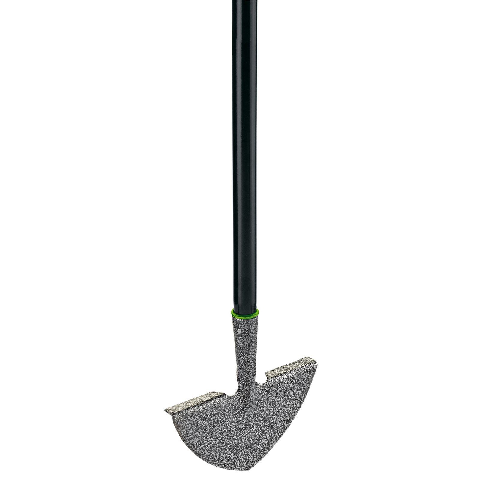Half - moon shape with turnover treads. Epoxy coated finish with head fixed to tubular steel handle. With black plastic "T" hand grip. Sold loose.