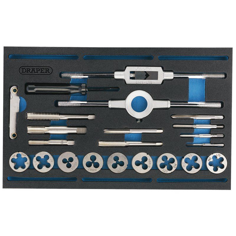 Expert Quality, manufactured from carbon steel. Taps and dies suitable for cleaning and cutting threads on mild steel and alu Minium. Supplied complete in a two tone 1/4 drawer EVA insert tray made from closed cell foam, suitable to be used in Draper and Draper Expert tool chests and other manufacturers similar tool chests.