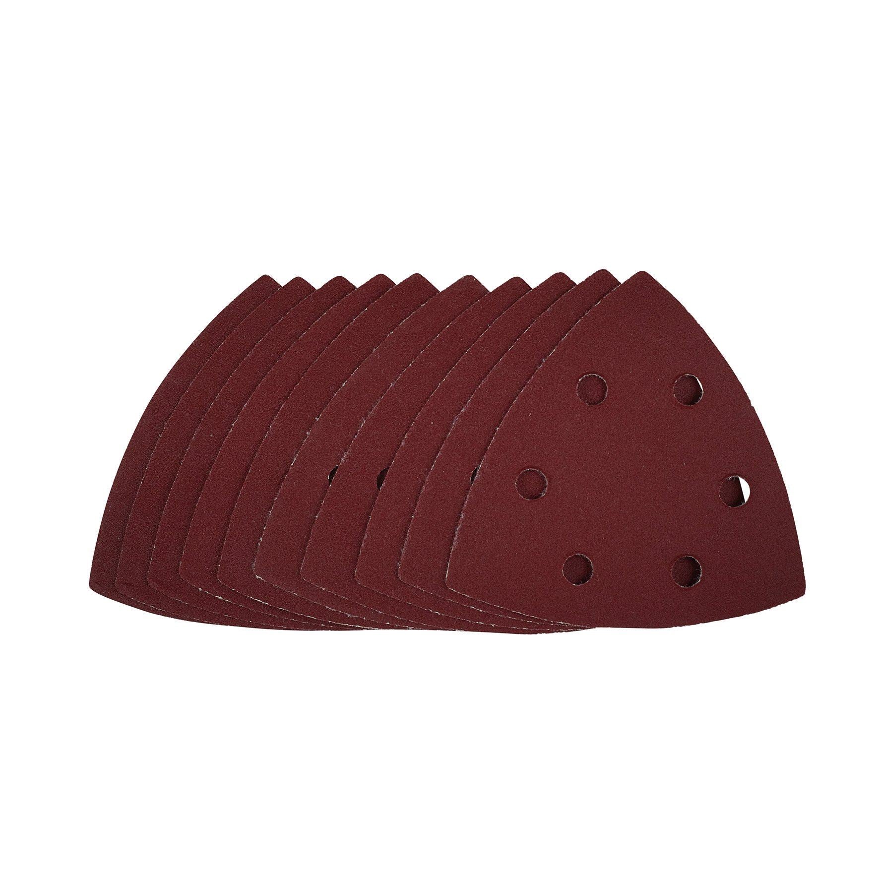 This pack of 93mm Delta sanding sheets are made from premium quality aluminium oxide that is resin bonded to provide improved grain adhesion, anti-static qualities and long-lasting performance. The heavy-duty E-Weight backing paper makes the sanding sheet more durable - able to withstand the toughest jobs. The hook and loop backing offers decent adhesion to facilitate the fast changing of sanding sheets. The six pre-punched 8mm holes improve dust extraction. Ideal for sanding and finishing wood, metal, aluminium alloy, painted surfaces, plastic and fillers. Compatible with most oscillating multi-tools with 93mm hook and loop backing pads including Stock No. 89482 and 55604.