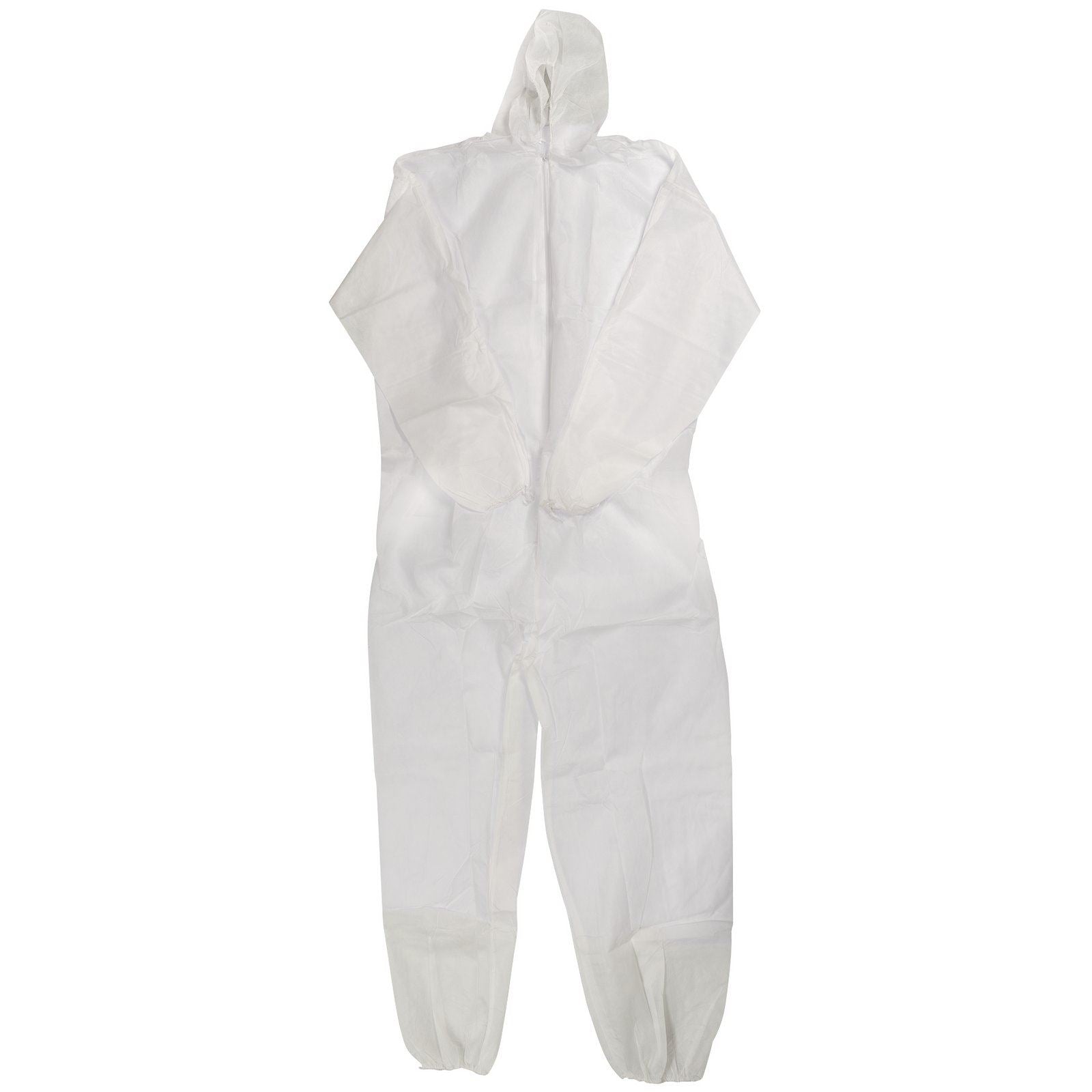 One size (XL) hooded disposable coverall with elasticated hood, cuffs, ankles, waistband and zip. Packed in polythene bag with header card.