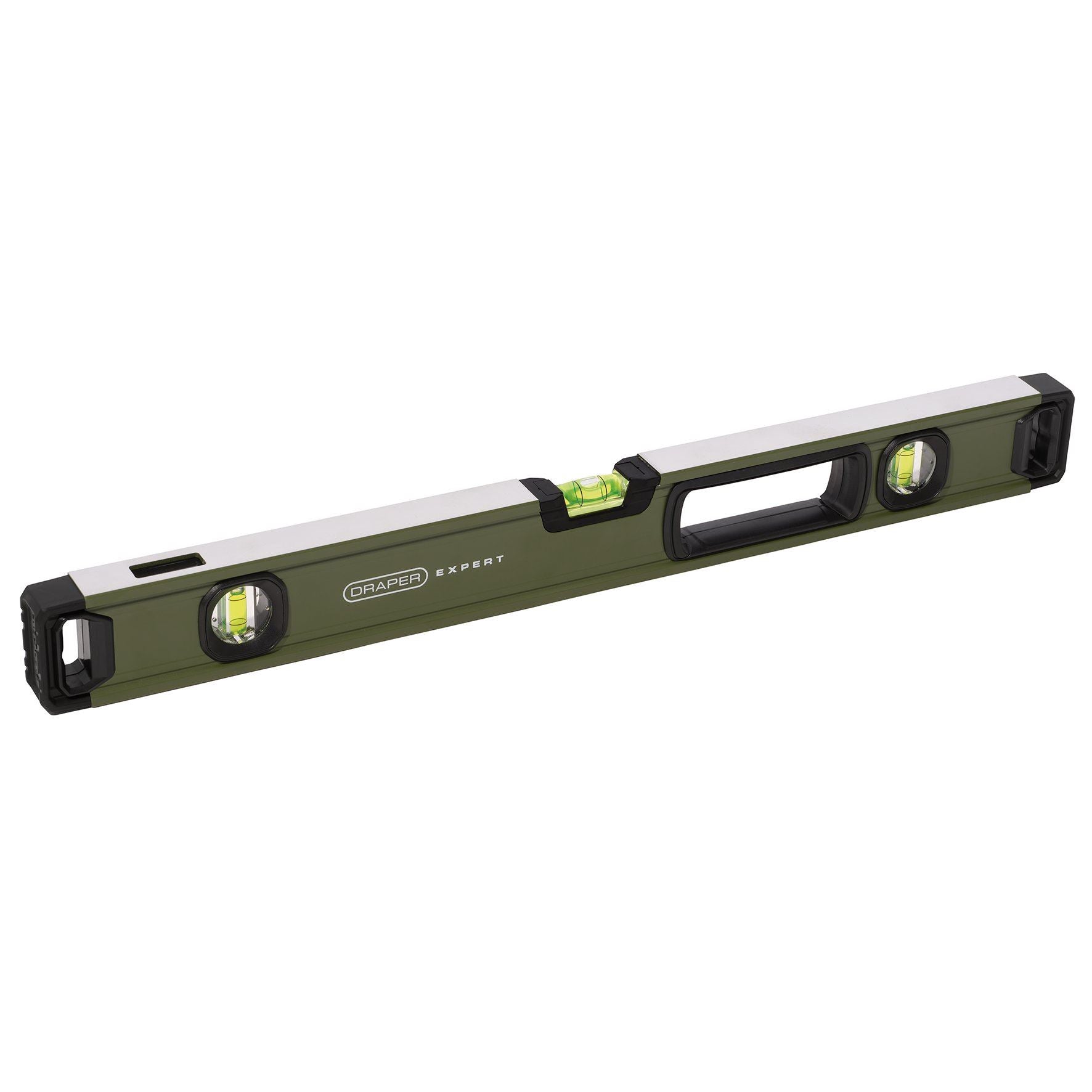 These professional heavy-duty box spirit levels are made from aluminium and have three vials. They feature a milled top and bottom surface for maximum stability and precise accuracy. The levels have a 180° domed/arc centre vial and two 90° vials. The vials are UV and shock-resistant, and the embossed rubber end caps provide added protection. For ease of use and portability, they include an integrated anti-slip handle. Hang holes are available for convenient storage at both ends. The accuracy is 0.5mm in a standard working position.