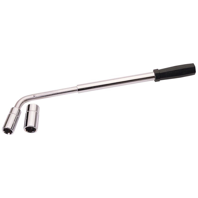 Supplied with two 1/2" sq. drive reversible sockets size 17 x 19mm and 21 x 23mm, manufactured from chrome vanadium steel. Handle extends to 525mm which helps to increase torque on difficult wheel nuts. With a soft-grip handle for easy comfort. Supplied with storage bag. Display packed.