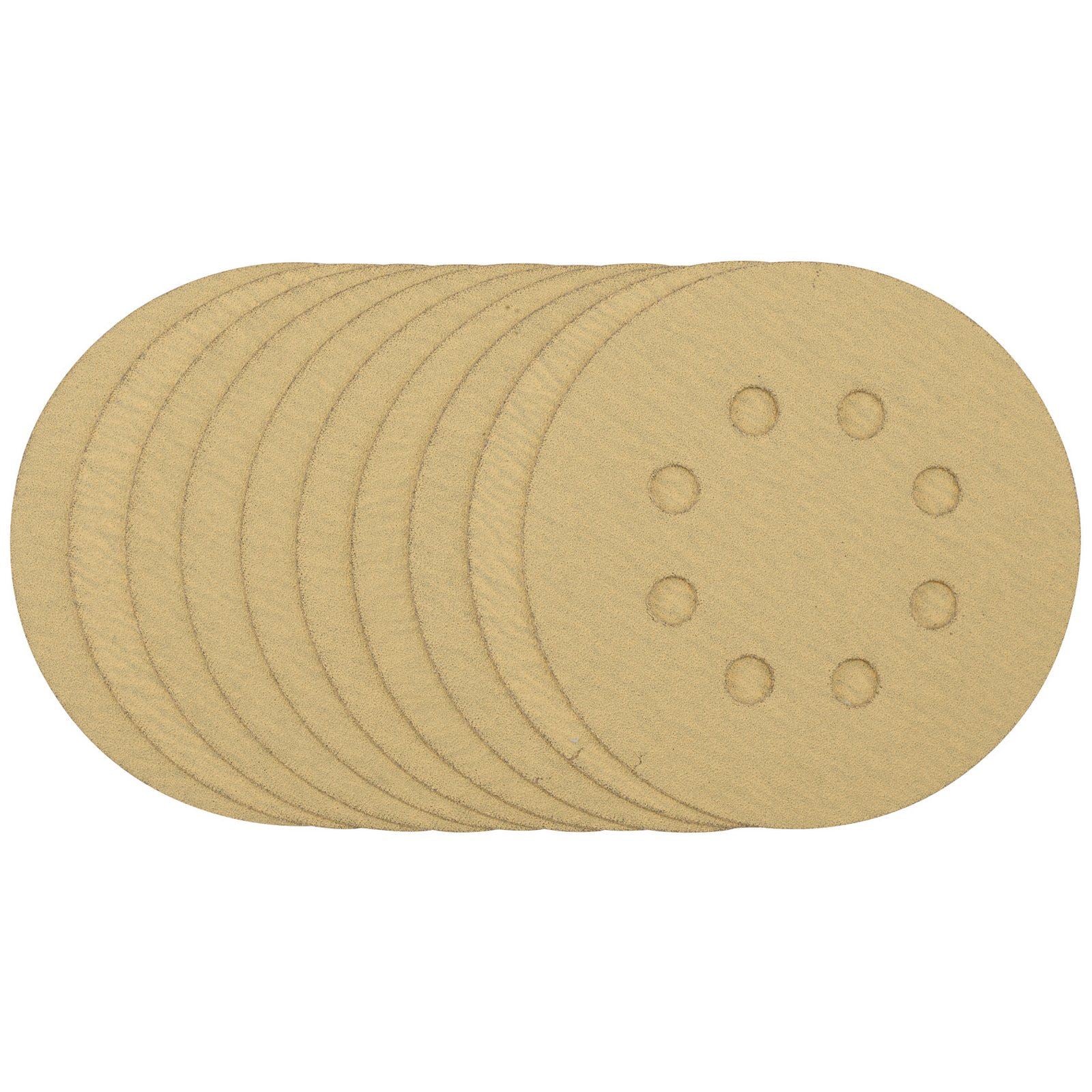 Pack of 10 gold sanding discs made from aluminium oxide with a special treatment of calcium stearate which is resin bonded to provide self-sharpening and anti-clogging performance. The heavy-duty D-Weight backing paper makes the sanding disc more durable - able to withstand the toughest jobs. The hook and loop backing offers decent adhesion to facilitate the fast changing of sanding discs. The eight pre-punched 8mm holes improve the dust extraction during sanding. Ideal for sanding and finishing wood, metals - including ferrous alloys, painted surfaces, varnish, plastic and fillers. Compatible with all 125mm random orbit sanders with a hook and loop backing pad, including Draper Stock No. 58097 and 89522.