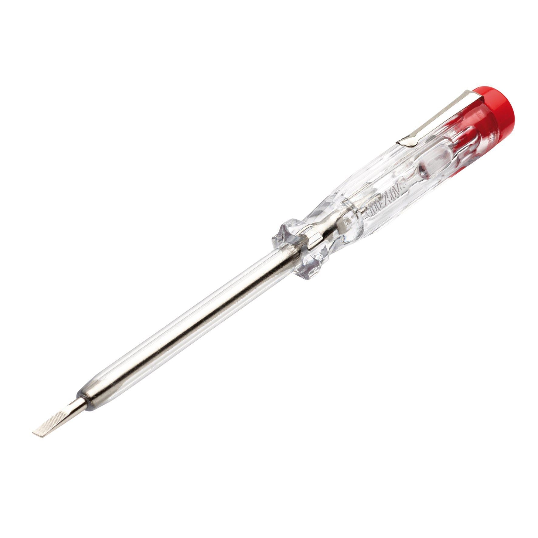 This mains tester is manufactured, tested and certified to all relevant UK and European standards. Slotted 3.5mm wide steel blade with insulated sheath for maximum safety. Transparent handle with voltage indicator lamp. Fitted with a chrome plated steel pocket clip. Voltage testing range 100-250V AC.