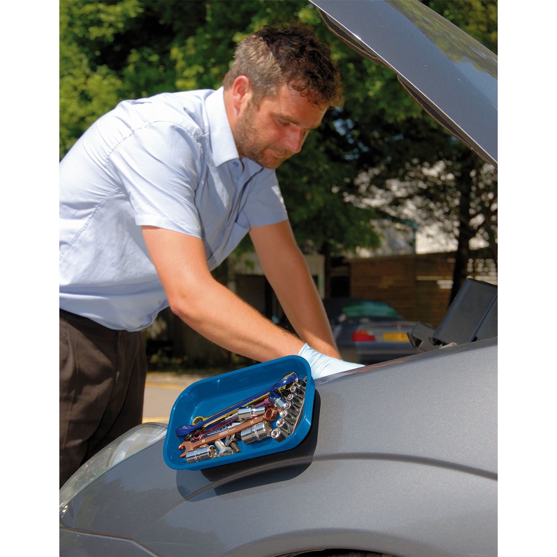 For storage of nuts, bolts, screws, etc. whilst working. Tray has magnetic base for affixing to metal objects such as tool chests etc. Magnetism transfers to inner surface of tray to retain small metal parts, nuts, bolts, etc. Sold loose.