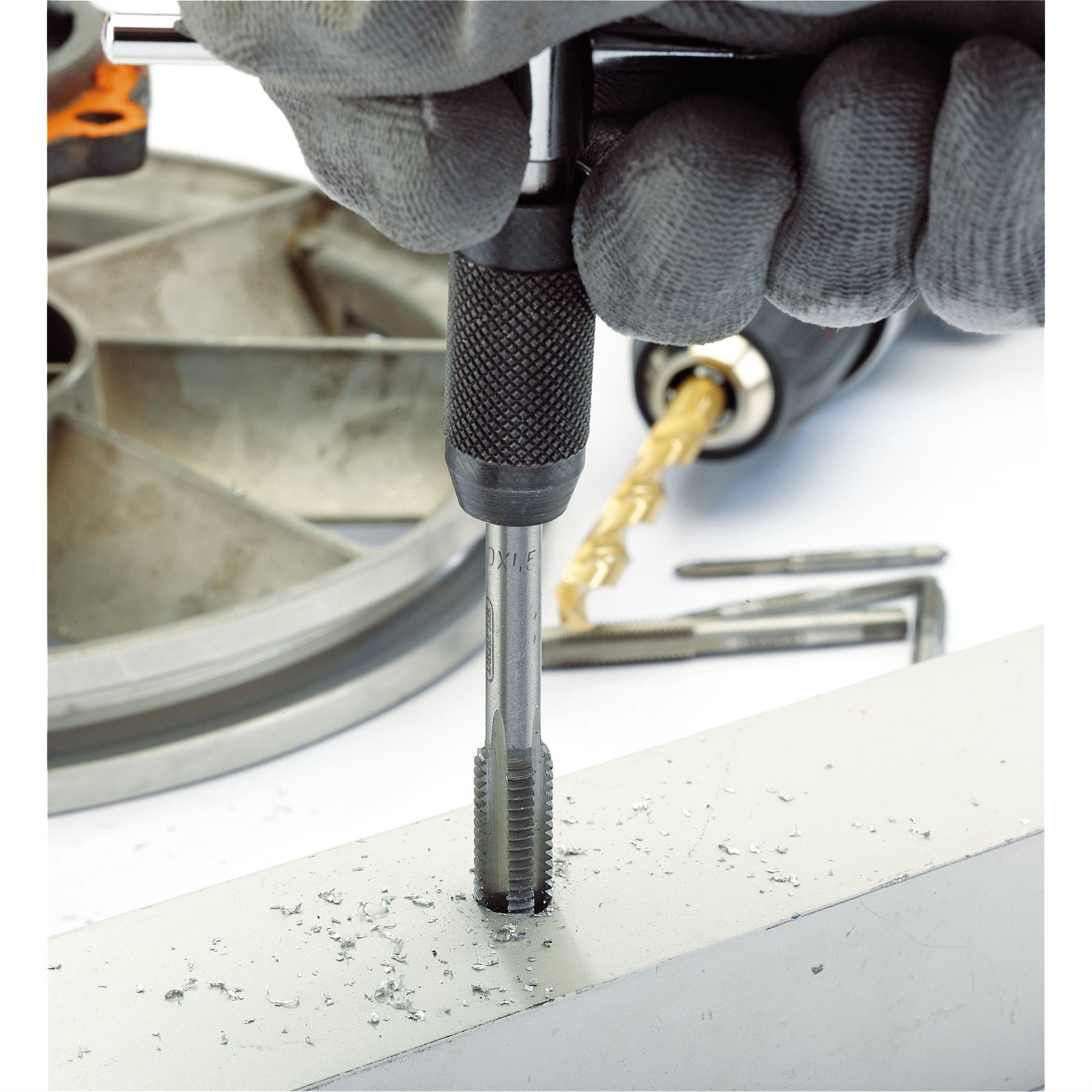 Popular sizes of carbon steel cut thread taps and 'T' type holder. Display packed.