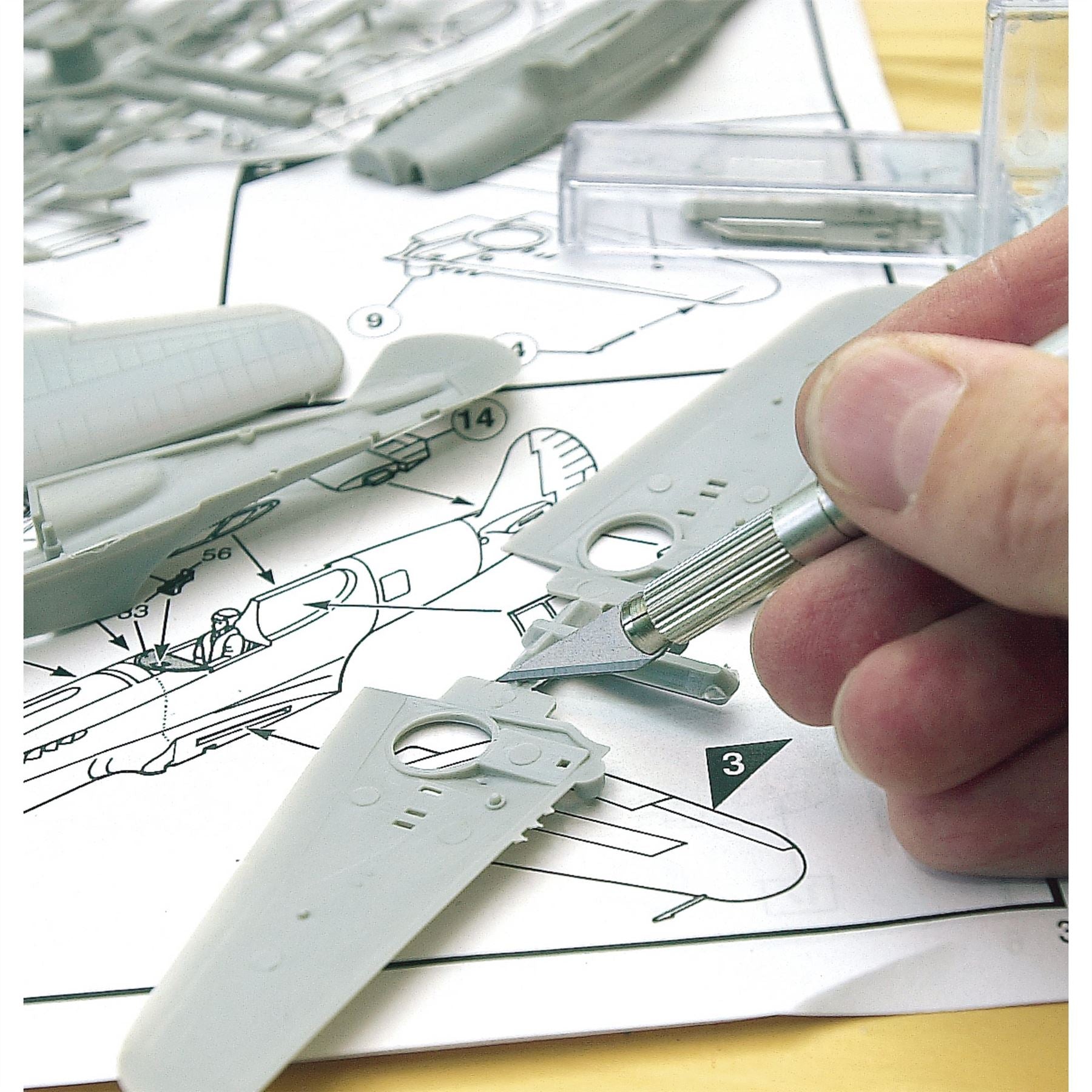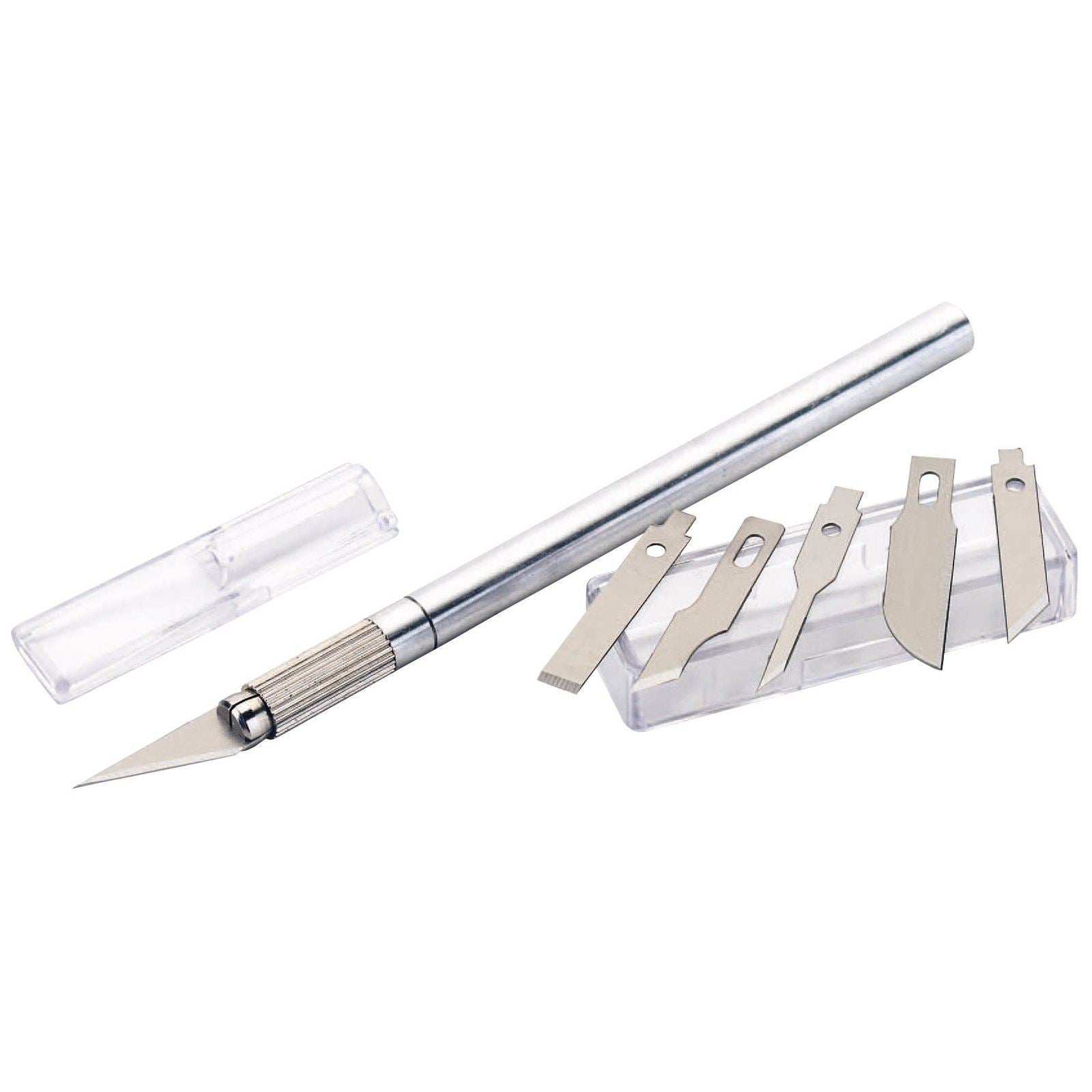 Ideal for craft and hobby applications such as model making, etching, carving, scoring and general paper trimming. Blade is held securely in a four jaw holding device, with a protective blade cap. 8mm diameter handle. Supplied with blade in handle and pack of five assorted blades. Display packed.