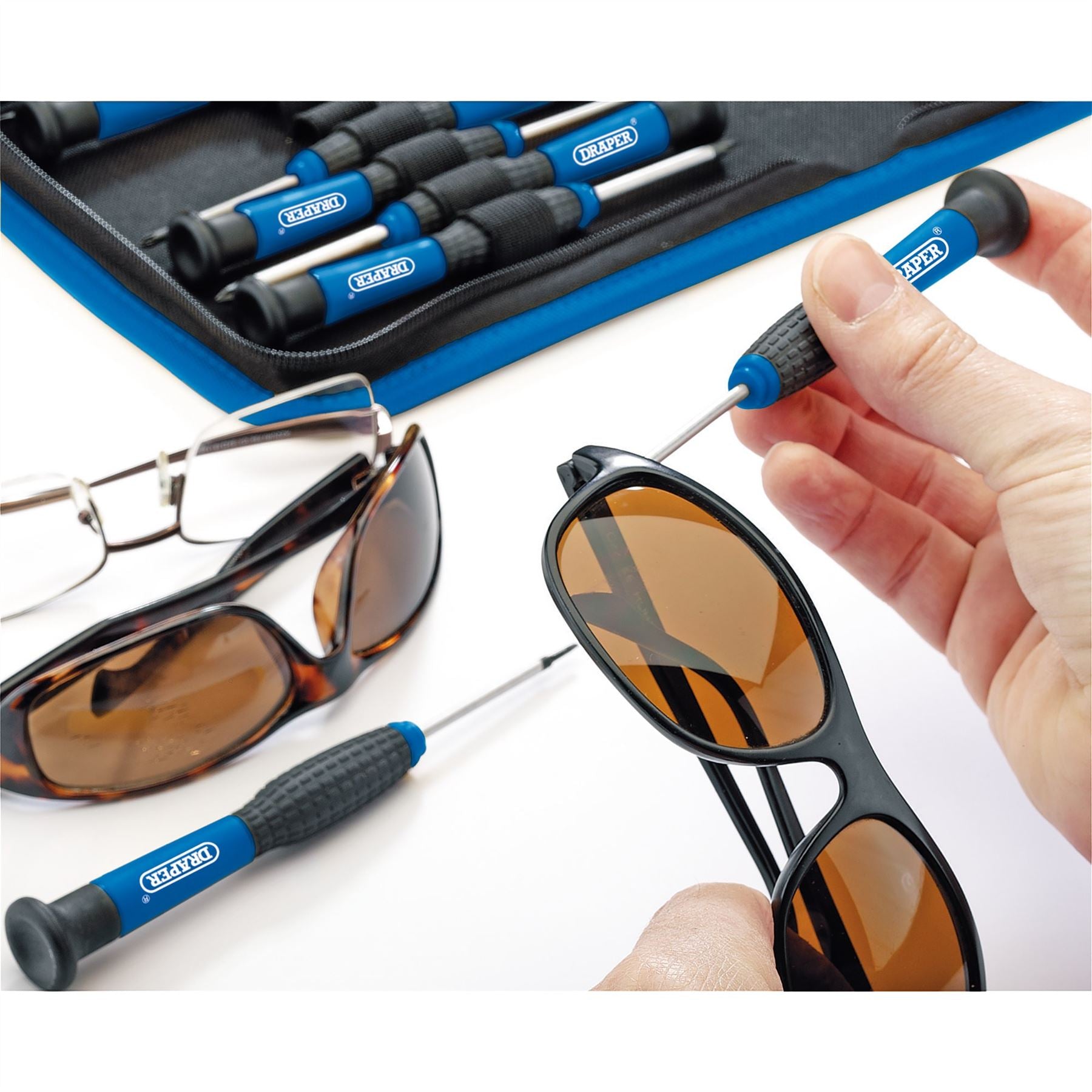 Handy combined set comprising a selection of precision pliers and screwdrivers. Pliers have forged carbon steel heads hardened and tempered with two tone handles. Screwdrivers have hardened chrome vanadium steel blades with satin chrome plated finish and black tips. Storage case with zip fastener. Multiples of eight sets only, Supplied in countertop display.